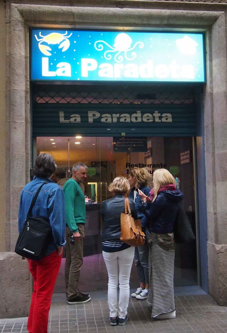 ラ パラデタはバルセロナに数件あるレストランで グラシア通りラ パラデタ (グラシア通り(Passeig de Gracia)はアクセスも良く、店舗も新しいので清潔ですね。入り口に市場の魚屋の用に魚介類が並べられていて量と料理方法をリクエストします。飲み物も含めて事前に会計をして番号札をもらって席に着きます。料理ができると厨房から番号が呼ばれて自分で料理をとりに行き最後は配膳に食器を返すと言ったハーフセルフパターンです。調理は焼く・蒸す・揚げるといったシンプルな調理なので日本人向けです。夕方5時から8時前は空いていますので早めに行く事をお勧めします。