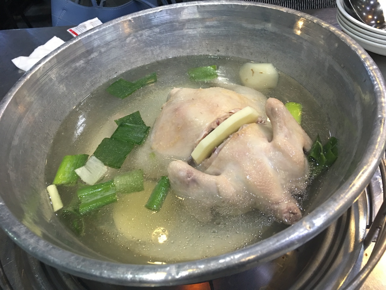 テーブルに着くと何も言わなくてもすぐに鶏の入った鍋が運ばれ、スタッフが作ってくれます。自分で好みで調味料を混ぜ。タデギが辛いですがやっぱりこれがあってこそのタッカンマリ。辛くて美味しい!ニンニクがきいてます。キムチはセルフで取ってきます。