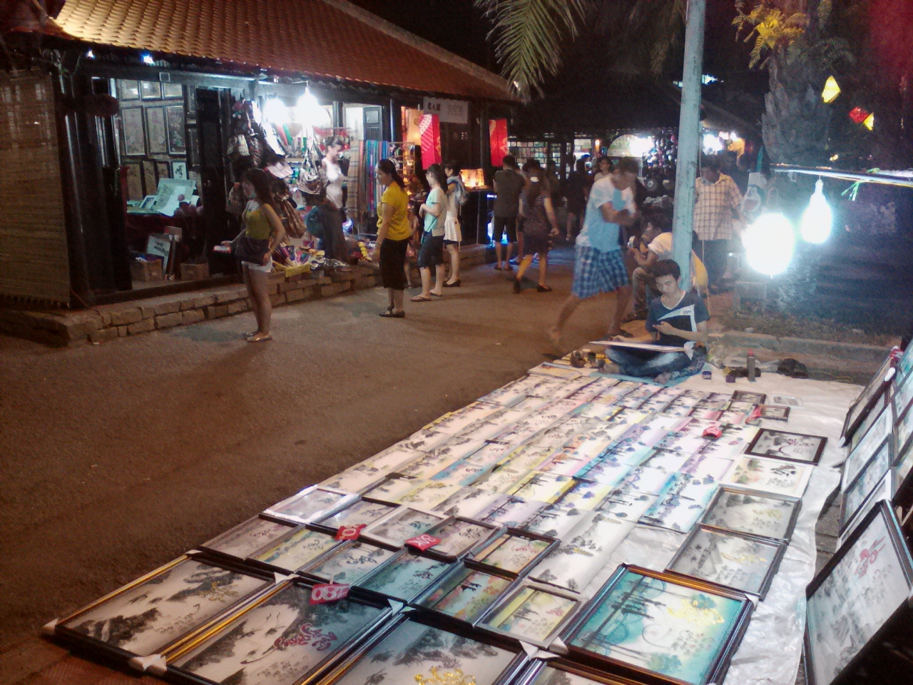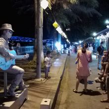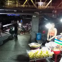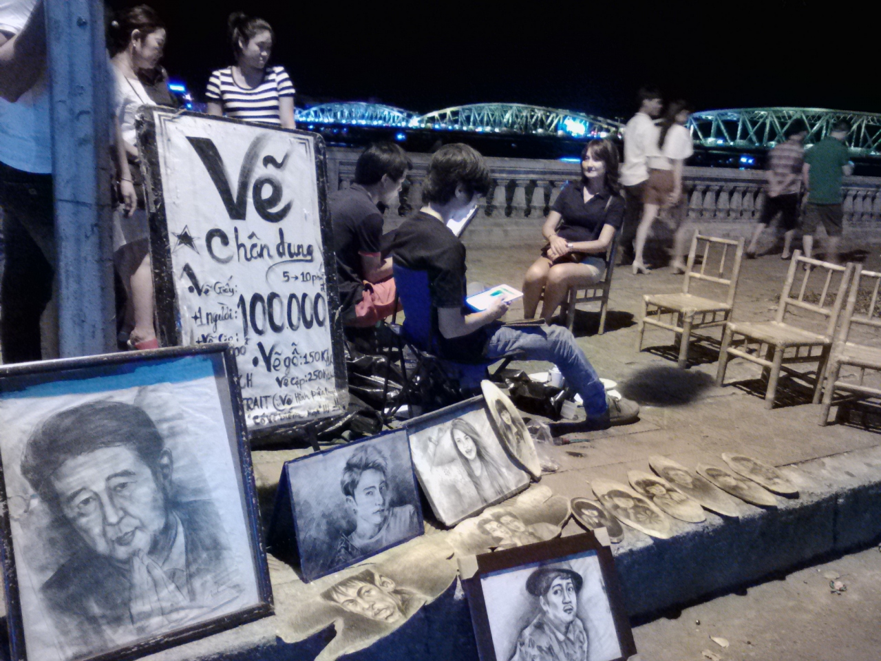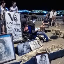 チャンティエン橋のライトアップは想像していたものよりショボくていまいち。その橋の南側の遊歩道にカフェや土産物屋が並んでいます。路上には完成度の低いパントマイマー、似顔絵屋、ベトナム風の絵を売る露店、橋の下辺りにはフルーツやスナック系の屋台もあります。食事の後の夕涼みをするにはいいところです。