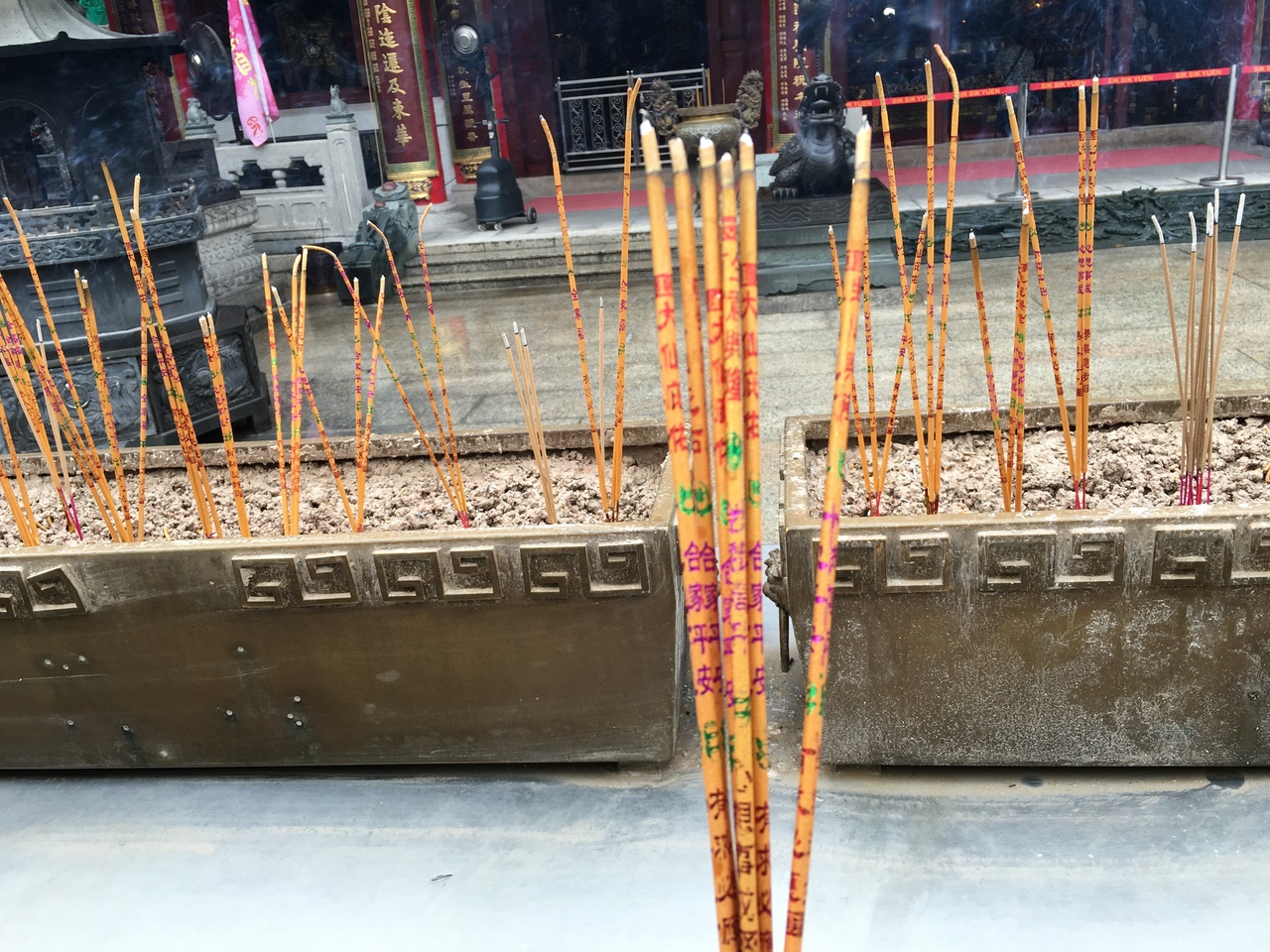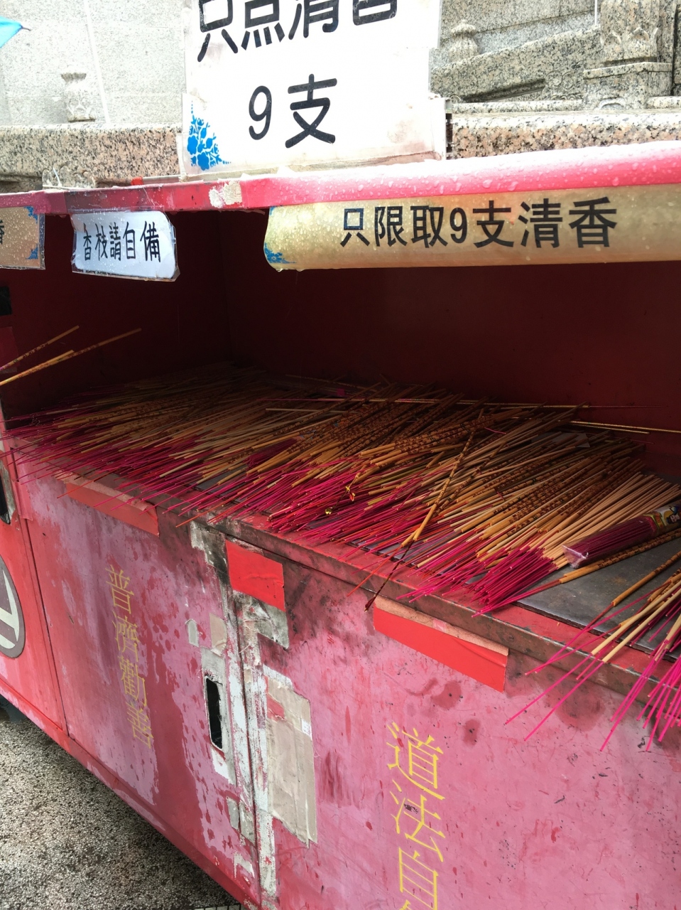 無料の線香を1人9本いただいて3箇所に3本ずつ立てます。立てたら名前、住所、願い事を言います。