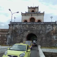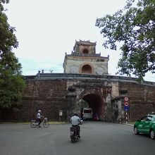 王宮を正面から見ると南東側にあたるため門には「東南門」と書かれています。この門も他の門と同様に通れる幅が狭い!現代の車用に造られていないので仕方ありません。そのため一方通行になっています。通行時には車やバイクに注意が必要です。近づくとレンガには所々に銃弾の跡が…、こんな所にもベトナム戦争の名残りが見られます。この門を抜けるとDinh Tien Hoang通り、旧市街の中心部に行けます。