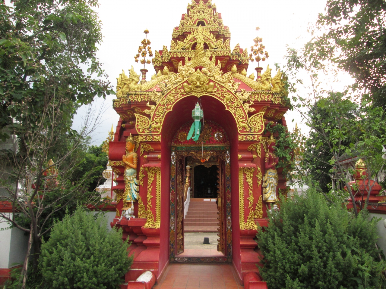 約二年ぶりに訪れたこのワット・ミンムアンはチェンライ市内の西側にあります。前回訪問したときは、境内は一部改装工事中でしたが、すっかりときれいになっていました。赤と金色のきれいな門が特徴的な寺院でした。