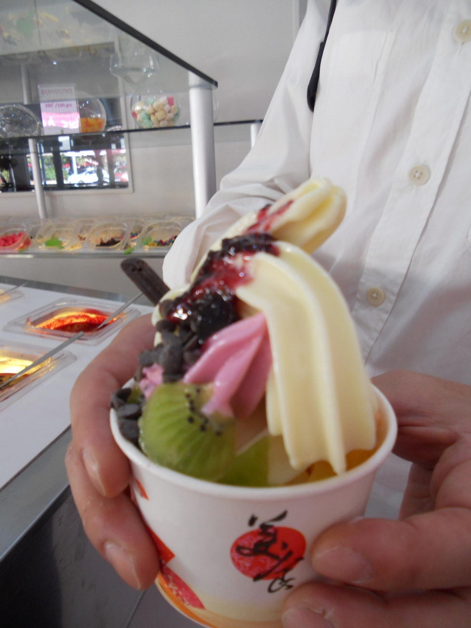 ヌメアの中心部、「ココティエ広場」や観光案内所からすぐ、近くに「ロクシタン」などもあるので、立地はとても良い場所にある、フローズンヨーグルトのお店です。