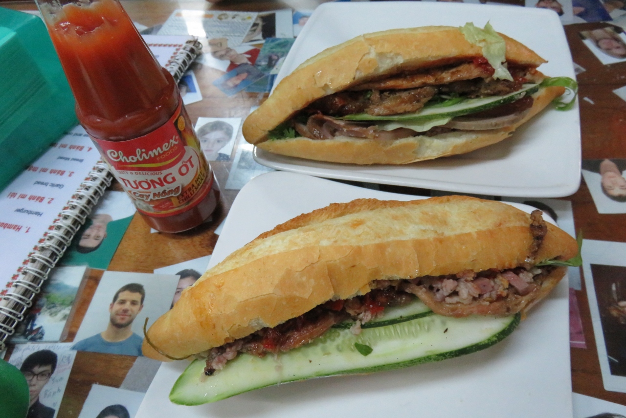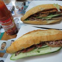 バインミー20000VND~で種類が豊富。世界で一番美味しいバインミーの店と評判になり、いつもテイクアウトのお客さんで外まで人があふれている。でも店内はすいていて、夕食時にテーブルで注文したらすぐに作ってもらえました。パリパリのフランスパンに具がたっぷりで美味しかったです。