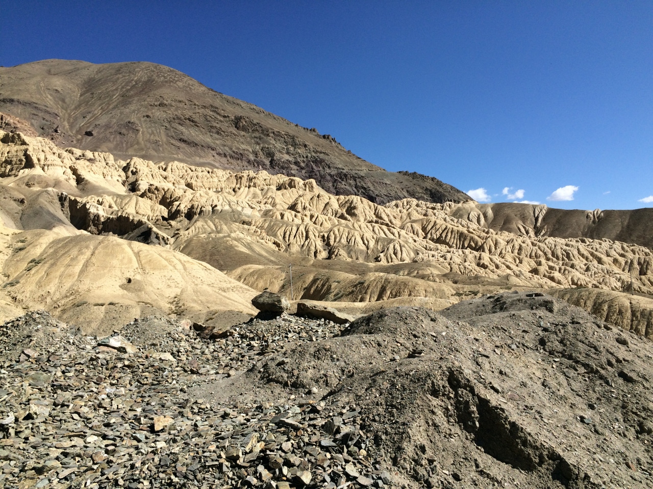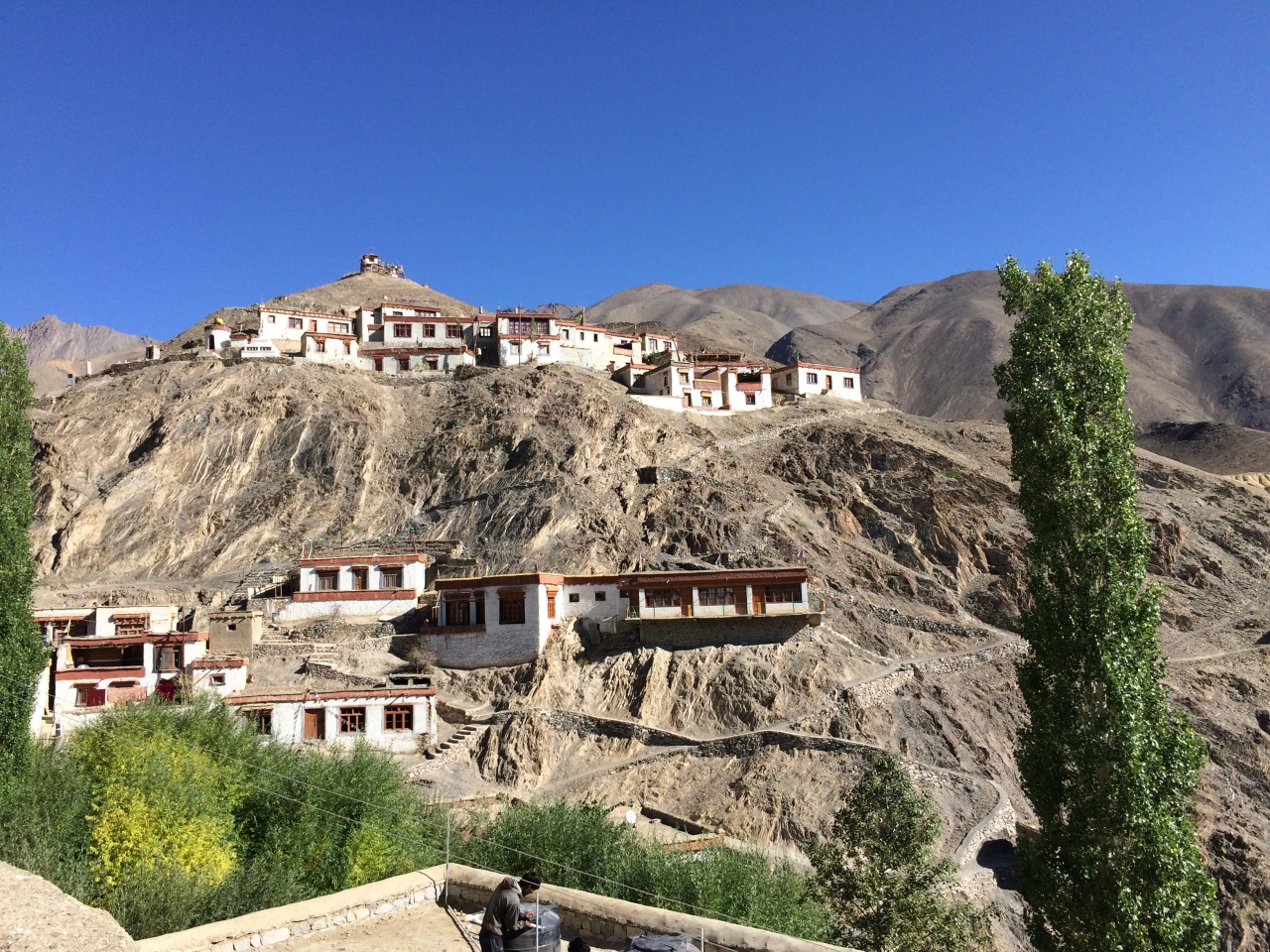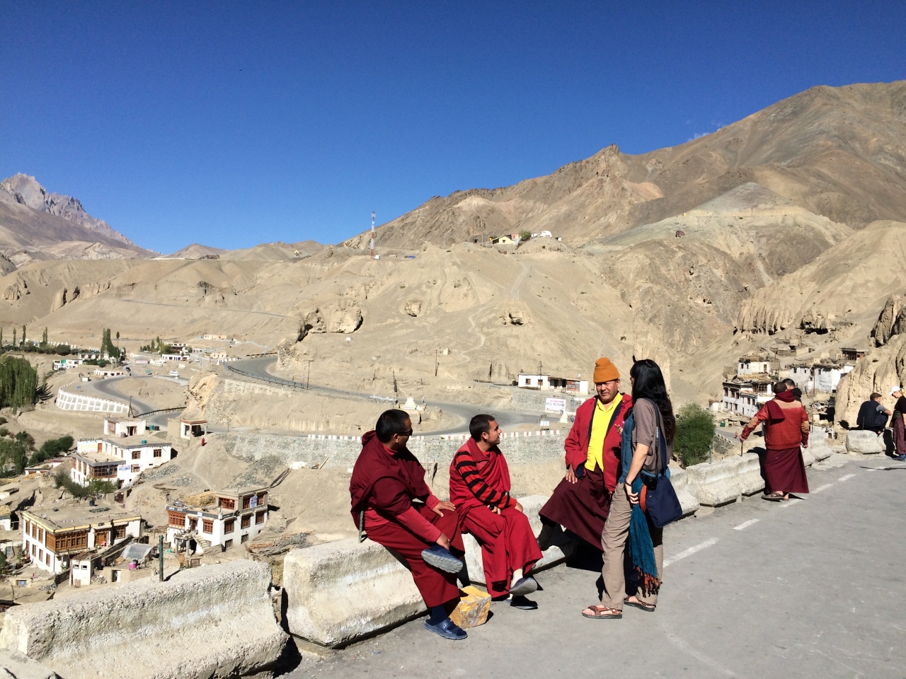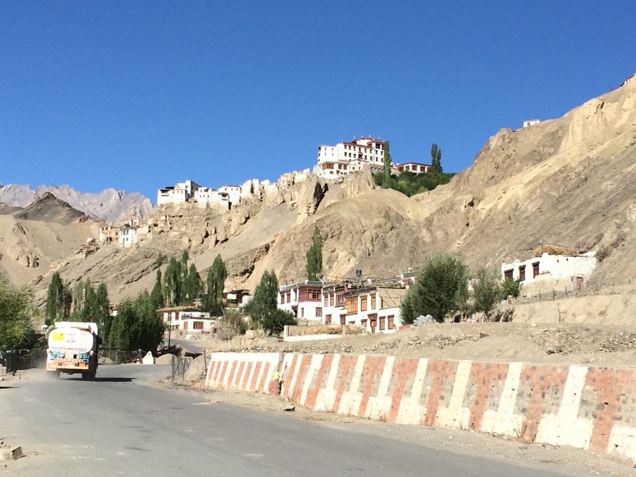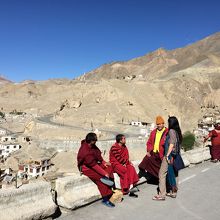 レー市内からインダス川に沿って下流へ車で2時間ほど走らせると、月の世界と呼ばれる、風雨に浸食されたライムストーンの地形が広がっていました。そこから間もなくで到着するのが11世紀に端を発するカギュ派のラマユル僧院です。白い壁の建物が山肌に並んでいるところはラダックのほかの僧院と似ていますが、多少数が少ないように思えました。観光客は多く、僧侶が観光客と話している姿も見られました。