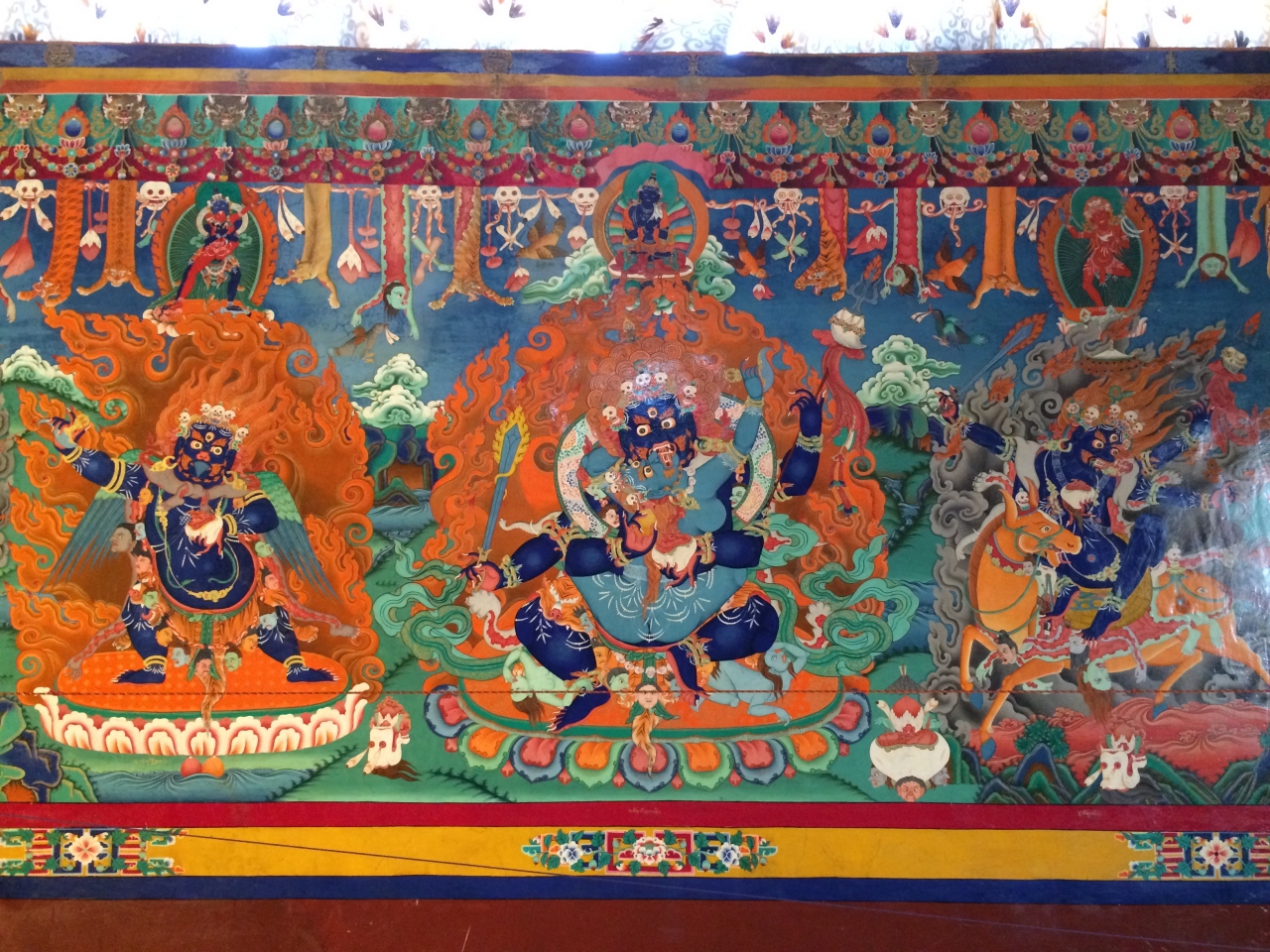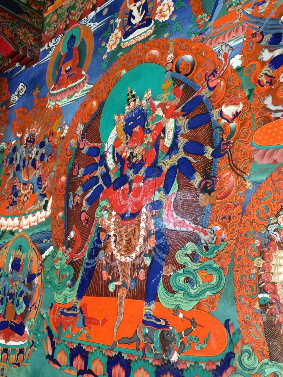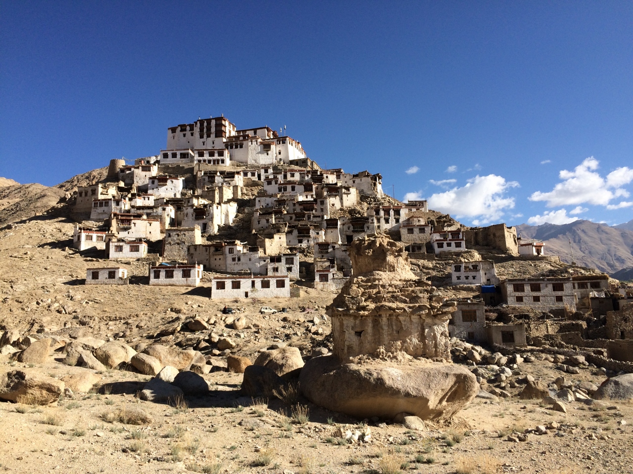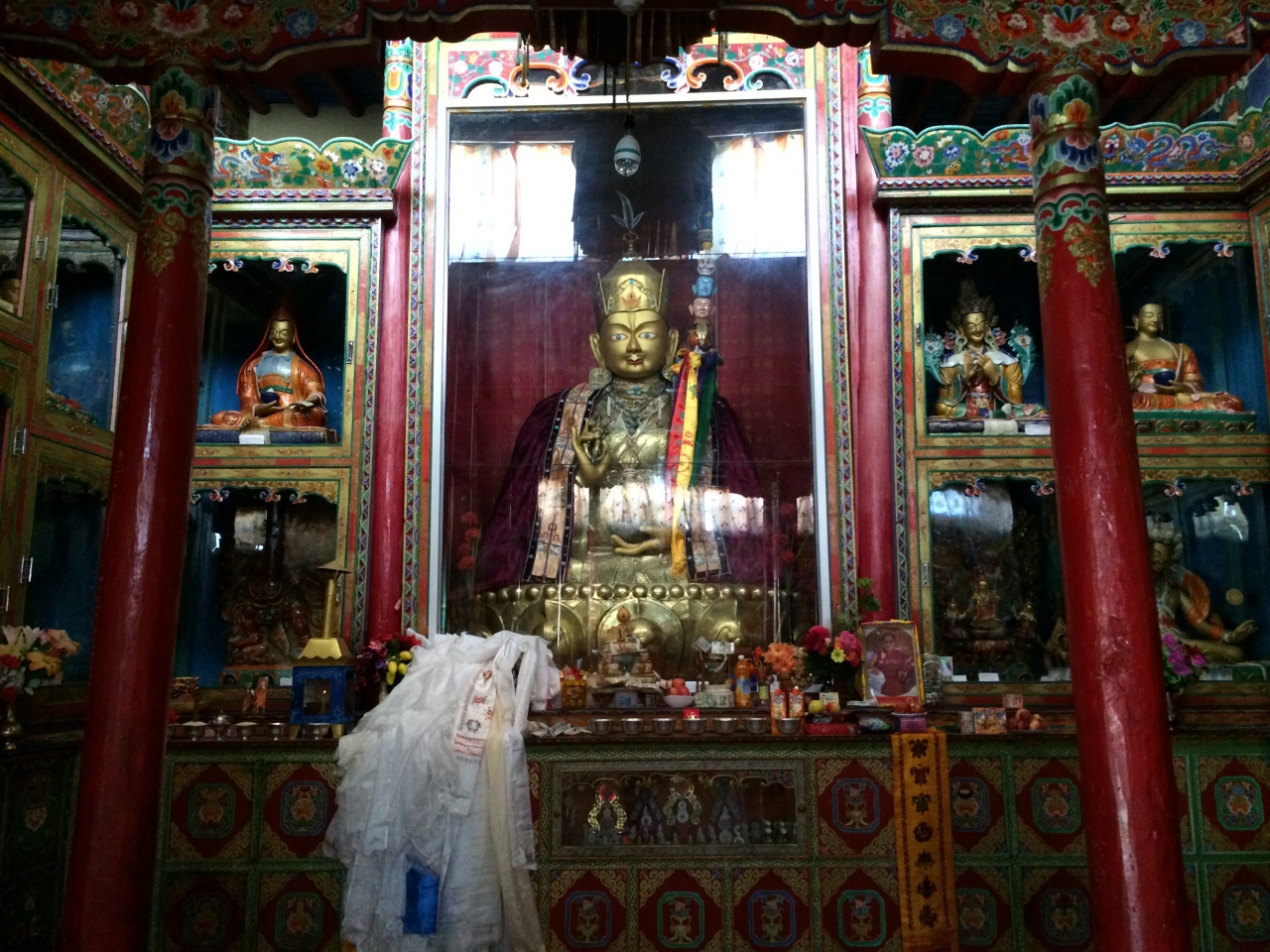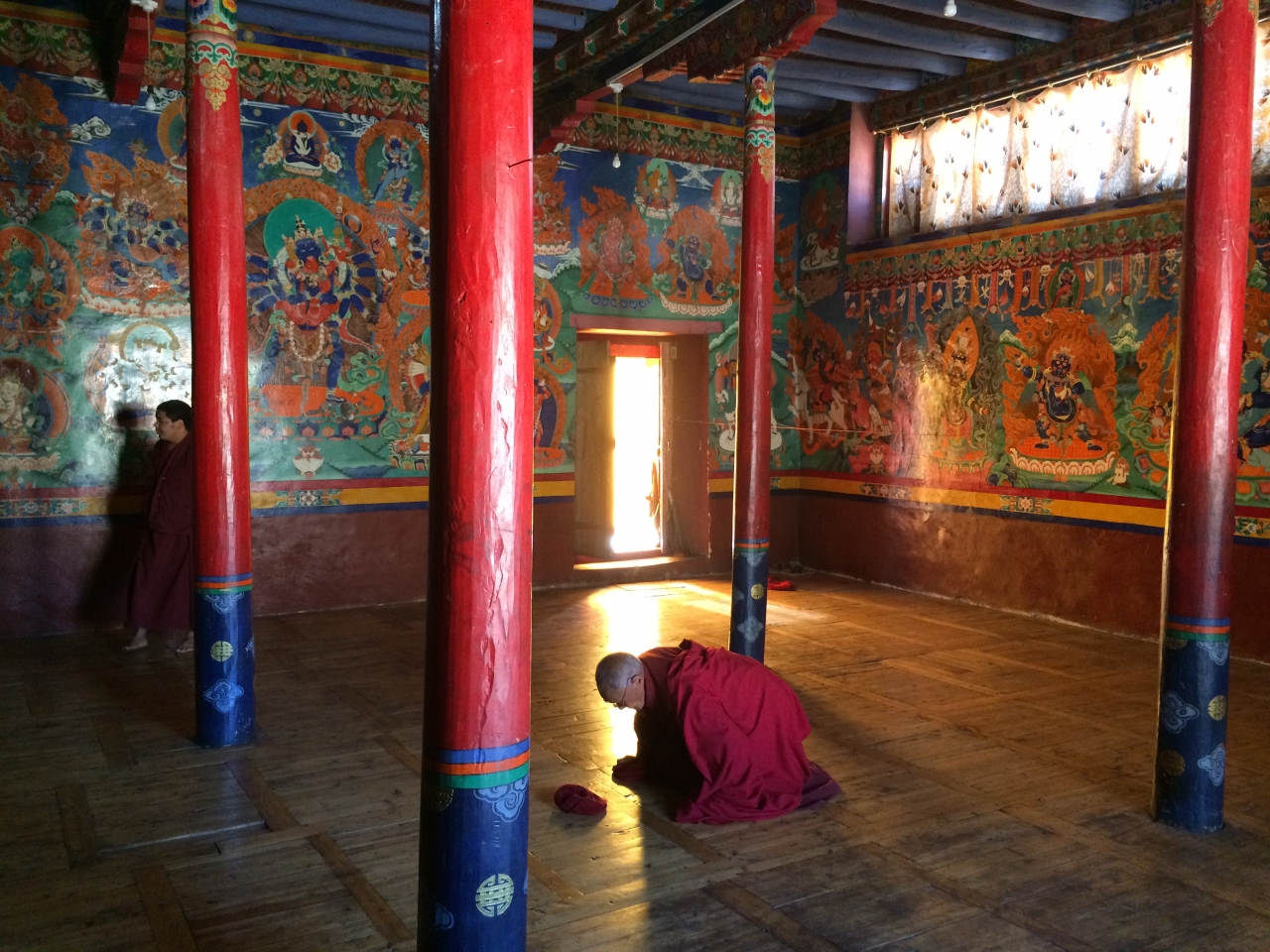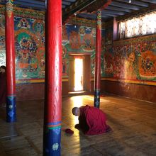 レー・マナリ・ハイウェイからチャンラ峠やパンゴン湖に延びるパンゴン・レイク・ロードへ入り、10kmほど車を走らせていくと左手に山の上に見えてきます。まさに荒涼とした場所に建つ僧院という印象で、外観の写真も何枚も撮影しましたが、それ以上に注目に値したのが、僧院内にある綺麗な壁画や仏像等でした。原色に近い色で壁一面委ちりばめられたように描かれた宗教画には圧巻でした。お勧めの僧院です。