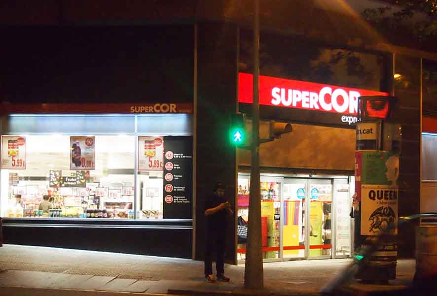 サグラダファミリア教会とガウディ広場の間を通るマリナ通り(Carrer de la Marina)を北に上ると角にあります。露店でのミネラルウォーター購入が嫌だったのでコンビニをさがしている時に見つけました。エクスプレスタイプのスーパーで日本のコンビニに近いです。アルコールもありました。結構いかついガードマンが店内を巡回しています。