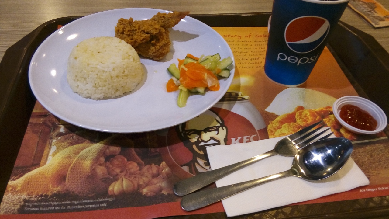 シュムリアップの目抜き通りにある、ご存じKFC。ちょびっとローカル風にアレンジされていますが、まぎれもなくケンタです。現地の物価感覚からするとちょいと割高。セットで大体3~5ドルぐらいです。明朗会計で安心できて良いです。