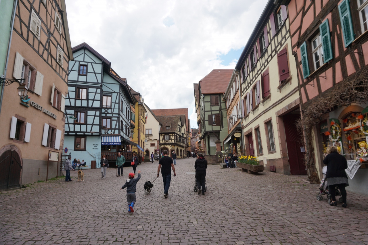 リクヴィルの村のメインストリートです。アルザスワイン街道をレンタカーでドライブした際に立ち寄りました。木骨組の家が連なり、まっすぐ歩いて行くと、ドルデーの塔にぶつかります。両側にはレストランやお土産屋がたくさんあって、歩いていて楽しい通りです。