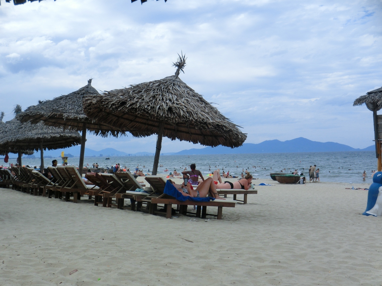 ホイアンの日本橋周辺から自転車で30分くらいです。街中は、地元の人に道を尋ねれば教えてくれます。街中を抜けると一本道です。たくさんの観光客が自転車でビーチへ向かっています。自転車はビーチに一番近いところに止めましたが、帰るときにお金を取られます。砂の上は暑くて素足で歩けないです。海はそれほど綺麗ではありません。ビーチチェアは店ごとに分かれていて、その店でドリンクとフードを注文すれば使えます。昼頃は混んでいてビーチチェアがほとんど空いていませんでした。