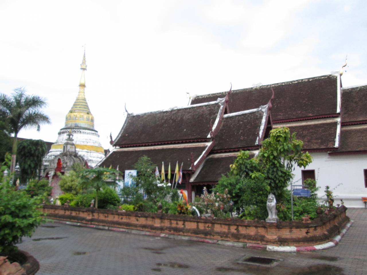チェンマイ市街地にある寺院で、ターペー通り沿いにあります。ターペー門やナイトバザール方面から徒歩で来れます。通りにはショップが並んでいる間に寺院の入口があるので、通り過ぎそうになりました。金色の本堂が多いタイのなかではシックな色でした。