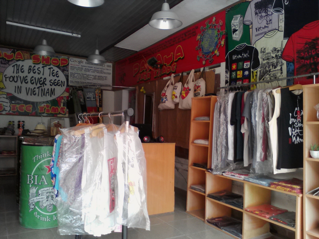 ハノイ、ホーチミン、ホイアンにも店舗をもつホップなデザインのTシャツ屋です。ベトナムビールや、ホーおじさん、アメコミなどのパクリ?デザインのものが多く19~33万ドンほどします。他にはトートバッグや手帳、帽子などもあります。入口にあるポストカード(1枚1.5万ドン)はこの店の完全オリジナル。なかなかイケてます。