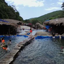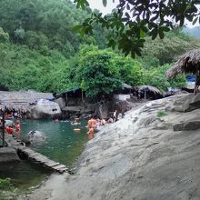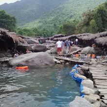 フエから知り合いの方に連れて行ってもらいました。車で所要1時間10分ほど。国道1号線から山側に2~3km入った所にあります。ベトナム語では Suối Voi と呼ばれています(suốiは渓流、voiは象の意味)。まずはゲート前で入場料を支払います。1人15000ドン、車10000ドン、バイク2000ドン。車で川の近くの駐車場まで行き、そこから徒歩で向かいます。滝と言っても大きなものが1つあるのではなく小さな滝がいくつもあるまさに渓流でした。この時は水量が少なく滝と呼べるものはありませんでしたが…。景色を眺めるというよりはその渓流沿い造られた涼床で食事をして川遊びをするところです。水も結構きれいで楽しめました。