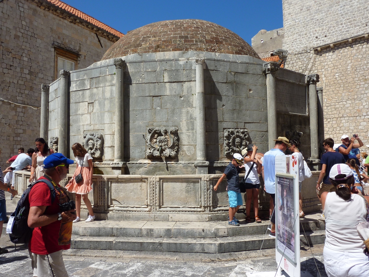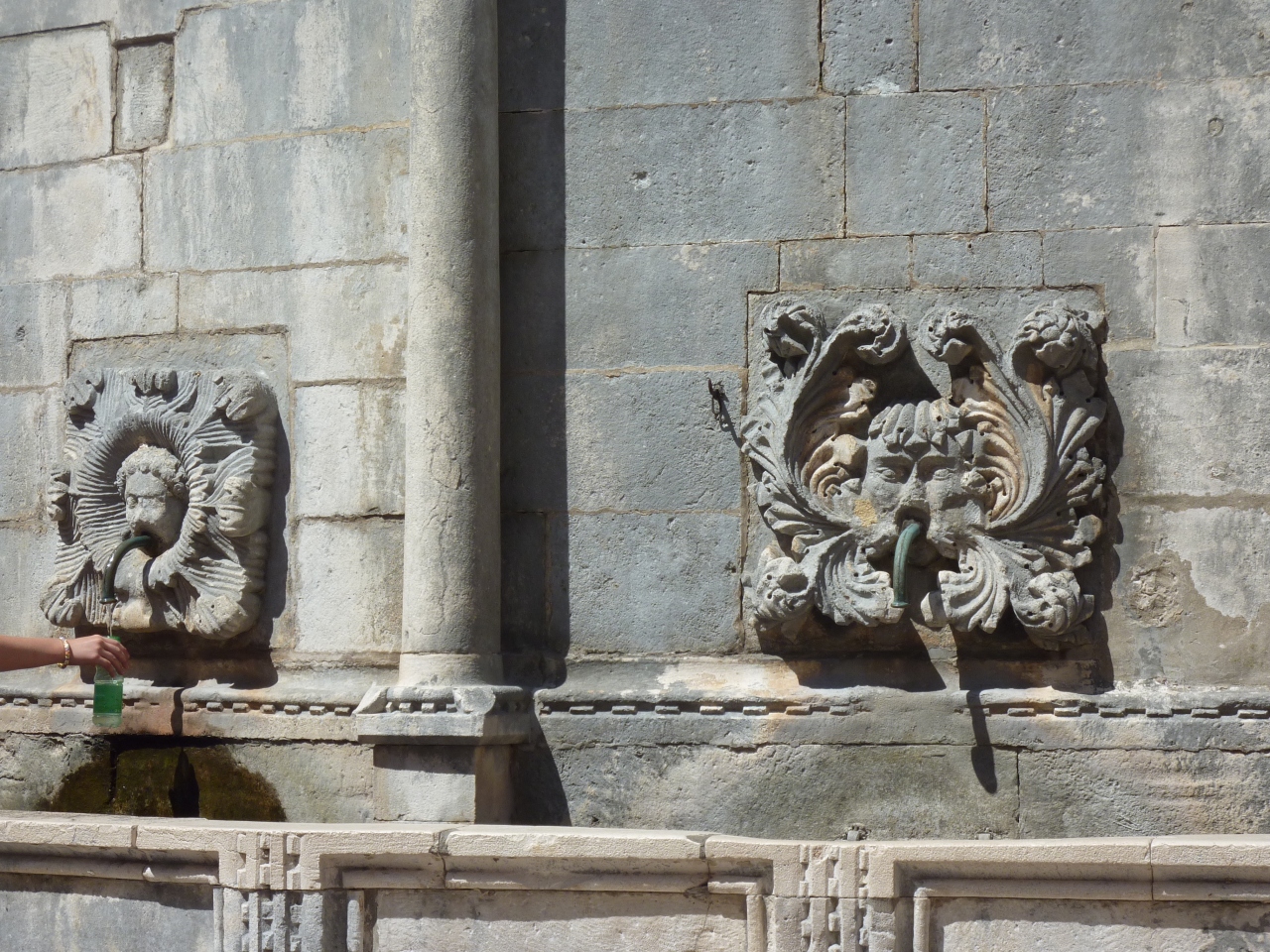 ピレ門から城壁内に入ってすぐ右手にあります。1438年にナポリのオノフリオ・デッラ・カヴァが作った16面の顔の口から水が噴き出しています。源泉は12kmも離れているそうです。16面のうち幾つかは水は出ていませんが、そこには人がいないので彫刻の顔が良く観察できます。特別冷たいと言えるほどではありませんが、町中散策中の飲み水として観光客の皆さんも利用していました。