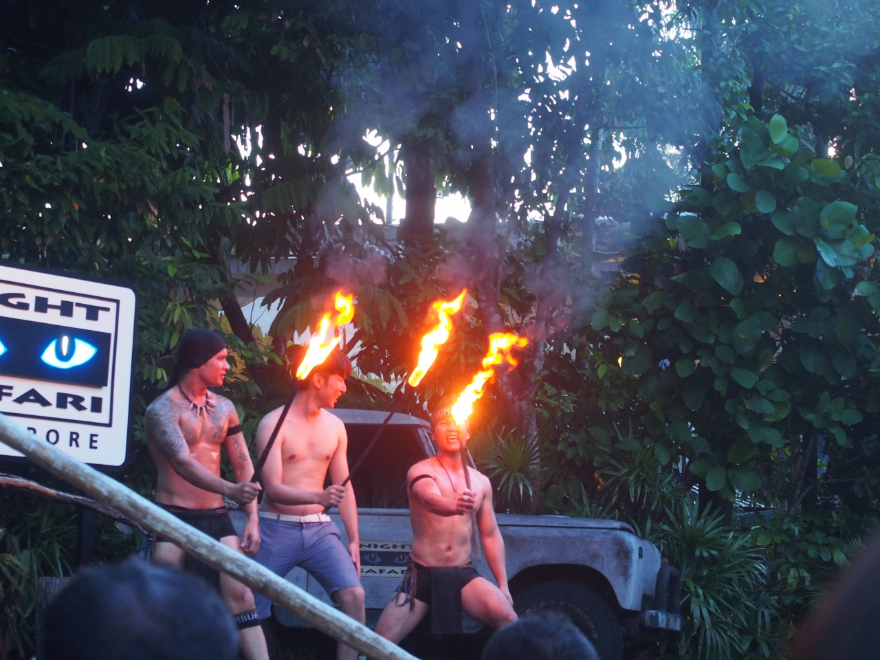 ショーが終わって、七時半のトラムに乗車。真っ暗な中を進みますので迫力あります。ちょっと怖い感じもあります。トラムを降りてすぐに走ればショーに間に合うようですが残念ながら少しだけ遅く間に合いませんでした。