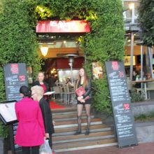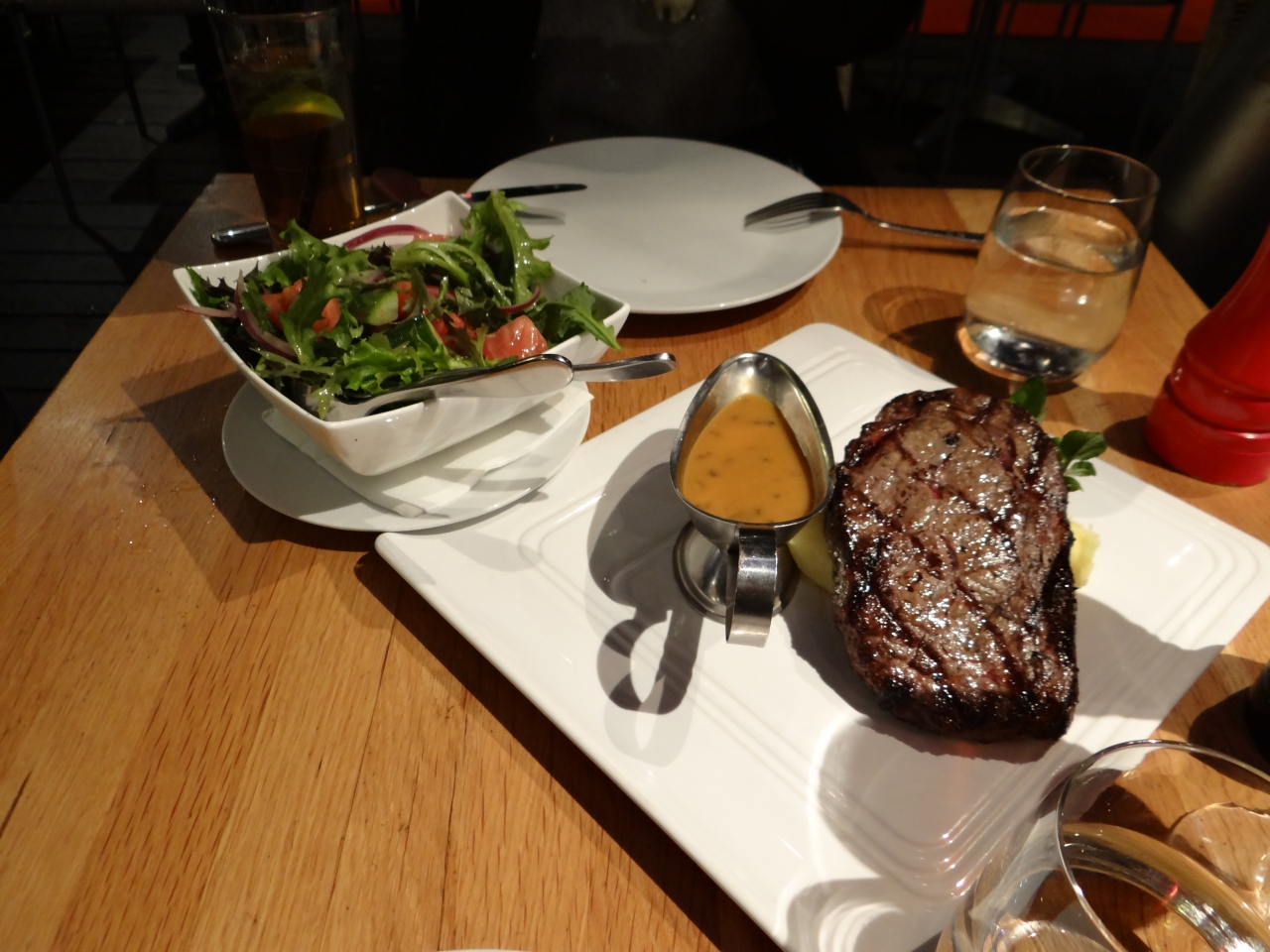 土曜日夜に行くつもりにしていたので、日本から予約していきました。ケータイに入ったコンファメーションを見せるとすぐに席に案内され、メニューを持って来てくれました。旅行記オススメのスコッチフィレ300g(ソースは別途マシュルームを注文)、サラダ、ガーリックブレッドをシェアして、後はビール2本とジンジャーエールにチップを足してA$90でした。ステーキはジューシーで選んだソースも美味しく満足でした。テラス席は広くありませんが、ダーリンハーバーを見ながらの食事は楽しかったです。