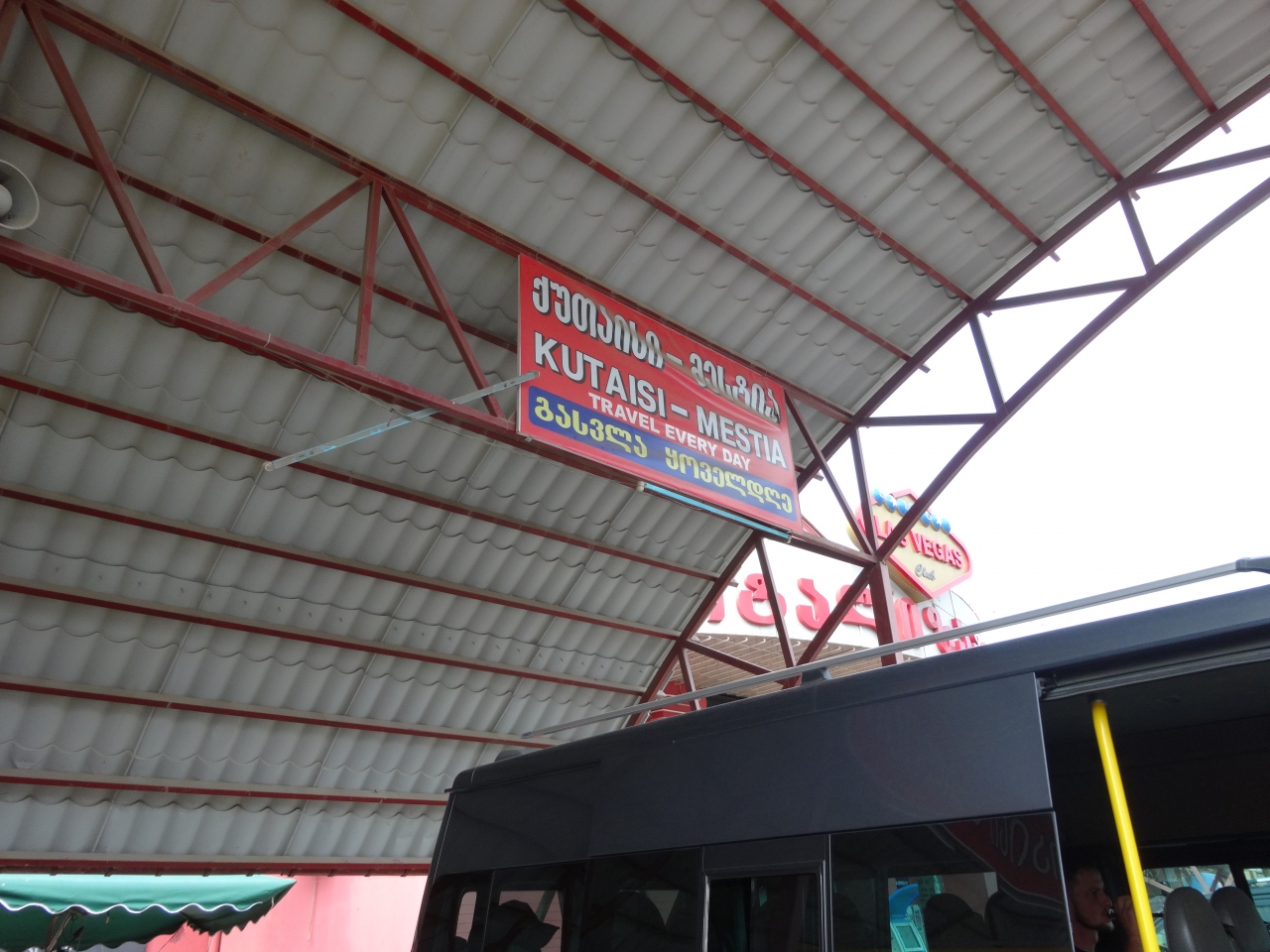 ここのマルシュルートカは、他の都市のバスターミナルと違って、決まった時間になっても時間通りに出発しませんでした。私たちは10時発のメスティア行きのバスに乗りましたが、結局1時間半くらい待つことになりました。メスティアからの帰りのバスも、トビリシ発のバスもそういうことはなかったのですが、あまり人がそろわない行き先だとこうなるのかもしれません。バスステーションからクタイシの中心部へは、タクシーで7GELくらいです。