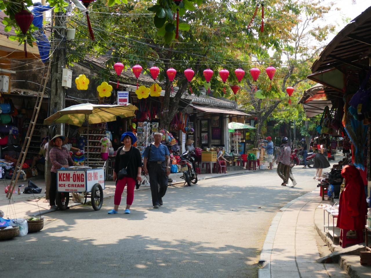 来遠橋やランタンに代表されるホイアンの旧市街、この雰囲気は大好きです。狭い道幅の通りに並ぶ店を眺めて歩いてもいいし、川の両側に並ぶ雰囲気のいいオープンカフェで休憩するのもいい。私は日中でしたが、夜はランタンが灯り、もっと幻想的なるようです。