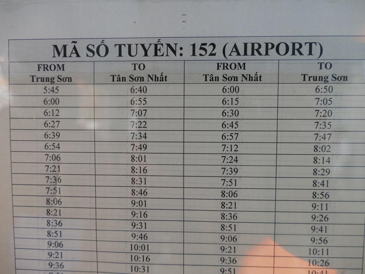 ホーチミン市街からタンソンニャット国際空港へのバス時刻表です。乗場はベンタイン市場のすぐ向かいのバスターミナル。料金は5,000VD。