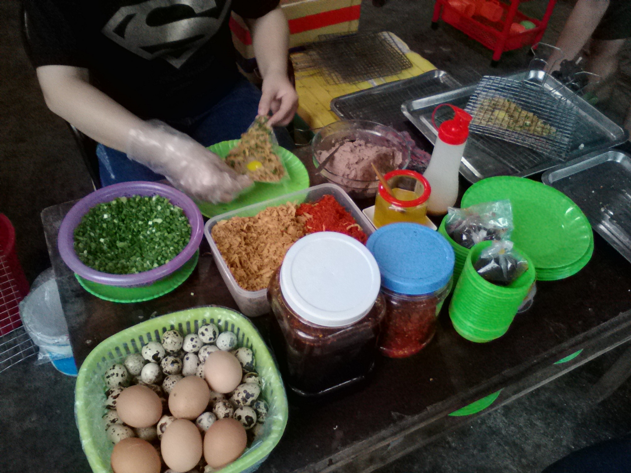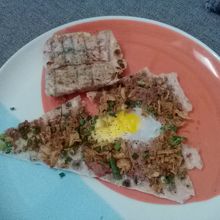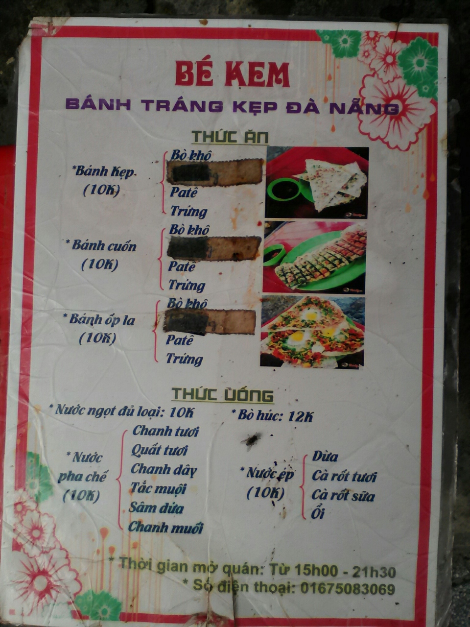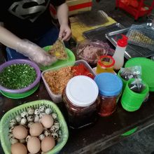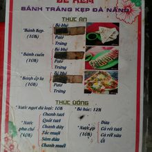 ダナン名物Bánh Tráng Kẹp(バン チャン ケップ)と呼ばれる駄菓子的なベトナム風ファストフードのお店。Bánh Tráng=ライスペーパー、Kẹp=挟むという意味でライスペーパーに具を乗せたり挟んだりして焼いたものです。3種類あるメニューから「Bánh Cuốn」(干し牛肉やネギなどを挟んで焼いたもの)と「Bánh ốp La」(牛肉やネギ、ウズラの卵を乗せて焼いたもの)の2つをオーダー。どちらも3枚で1万ドンです。味もおいしい!小腹の空いた時やおやつにぴったり、ビールのつまみにもなります。店でも食べられますがテイクアウトもできます。15:00過ぎ頃からオープンなのでご注意を。