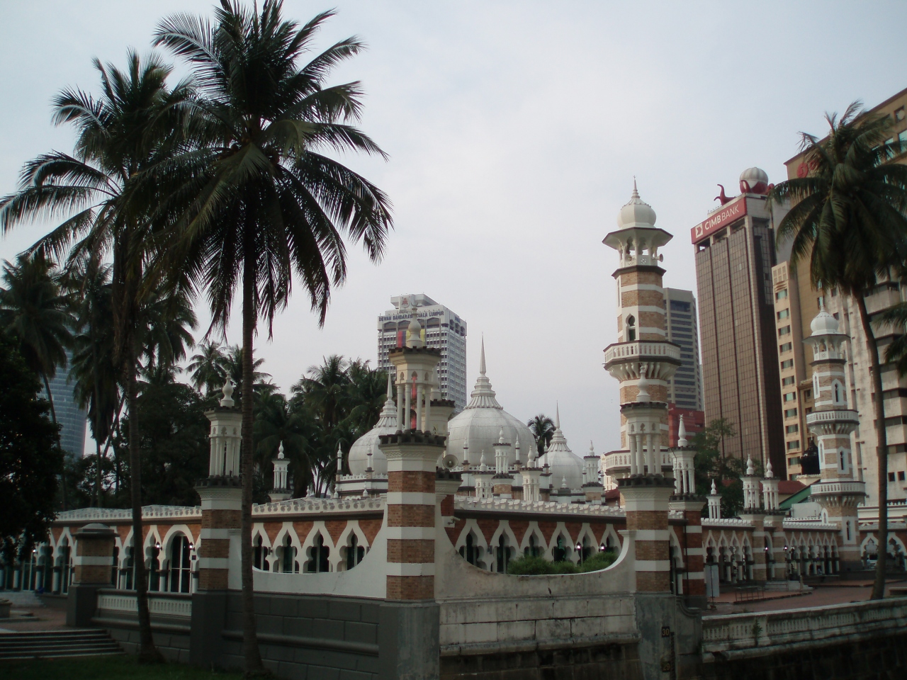 クアラルンプールの市街地中心分をほぞ細と流れるクラン川とゴンバック川の合流地点にこのモスクは建っています。