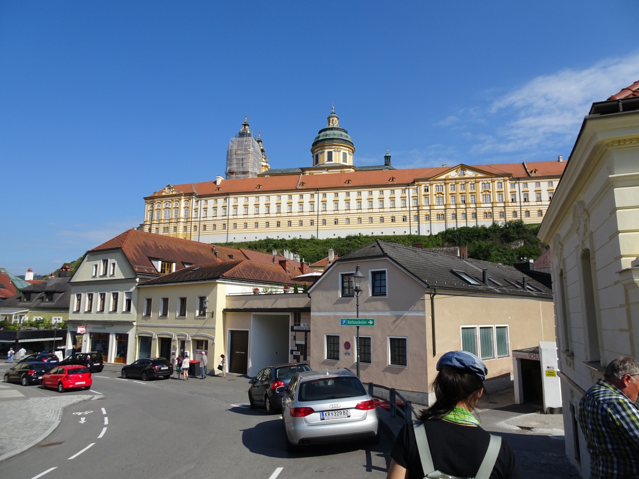 メルクの駅から中心街へ向かう道です。正面には丘の上に黄色く輝くメルク修道院が見えて、歩くごとに迫ってきます。道沿いの家もとてもオシャレできれいで、歩くのが楽しい通りです。市街地までは駅から5分ほどで着きます。