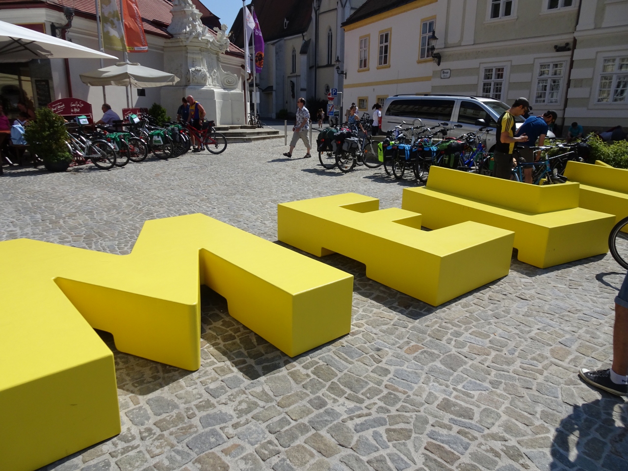 メルクの中心部にあたる広場です。教会があり、石畳が広がりとてもきれいな場所でした。MELKと書かれた大きなブロックがあったのが面白かったです。記念撮影でさっそく撮りました。また見上げるとメルク修道院の美しい建物も見応えがあります。