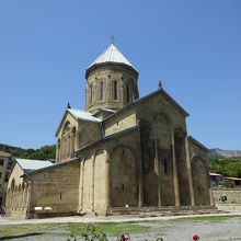 なかなか立派な教会です。周りが開けているので、建物の全貌を存分に眺めることができました。外側の、とくにドームを支える円筒部分の窓枠周りなど、彫刻が複雑で美しいです。屋根の頂点のところにはミニ教会がちょこんと乗っています。壁の外側に左右対称に溝があり、このデザインがアルメニア教会建築と似ています。