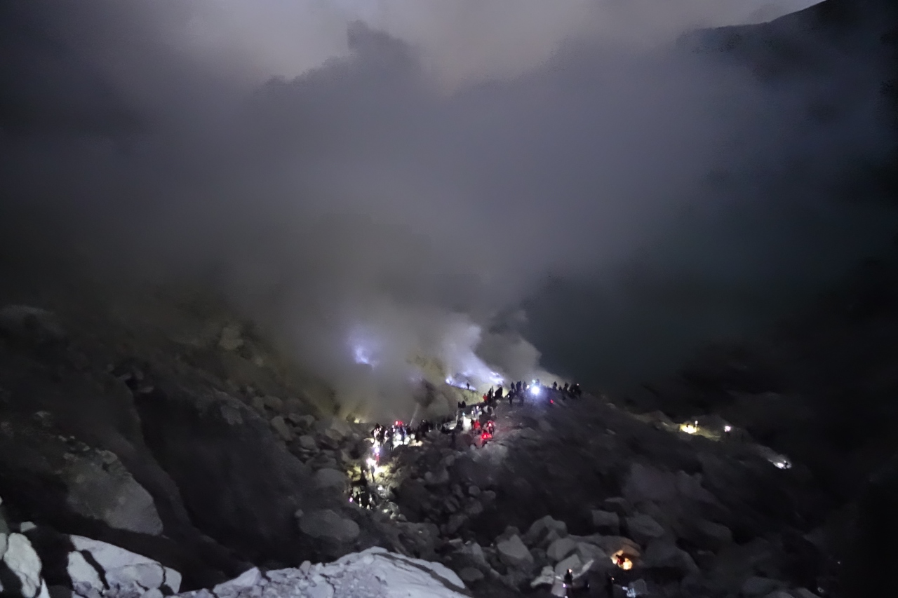 2日目はブロモ山麓からイジェン火口湖の側の宿泊所へ。この間もけっこう離れており小型バンでまたまた7時間ほどかけて移動しました。イジェン火口湖そばの宿泊所では夕食を取り少し仮眠をとり、その日の夜中1時半にイジェン火口湖に出発です。宿泊所からは車で1時間ほどで麓につきます。そこでグループごとに担当のガイドがつき、ガイドからガスマスクを渡され、いよいよ火口湖に向います。西洋人を中心にかなり観光客が来ていました。麓から火口湖周辺までは歩いて1時間程度の登山になります。私は普段登山をしているのでなんともなかったですが、途中休み休みハハア言いながら歩いている人をけっこう見かけたので普段運動をしていない人にはきついのかもしれません。