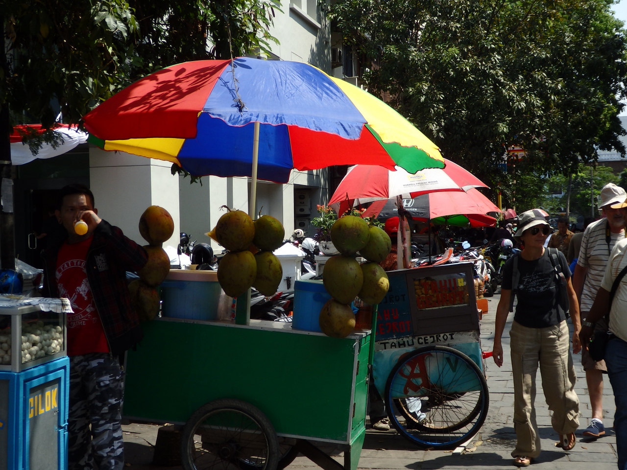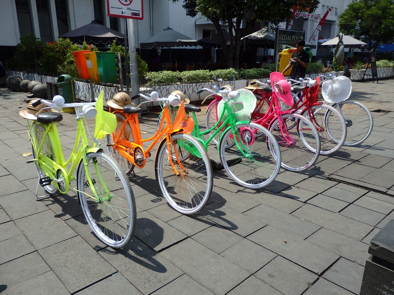 広場付近には、飲み物を売る屋台がいくつもあります。また、カラフルなレンタル自転車もありました。