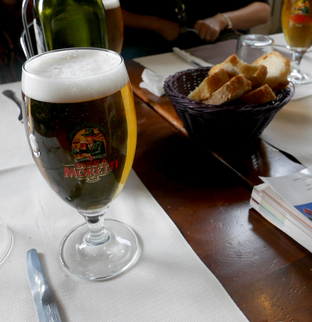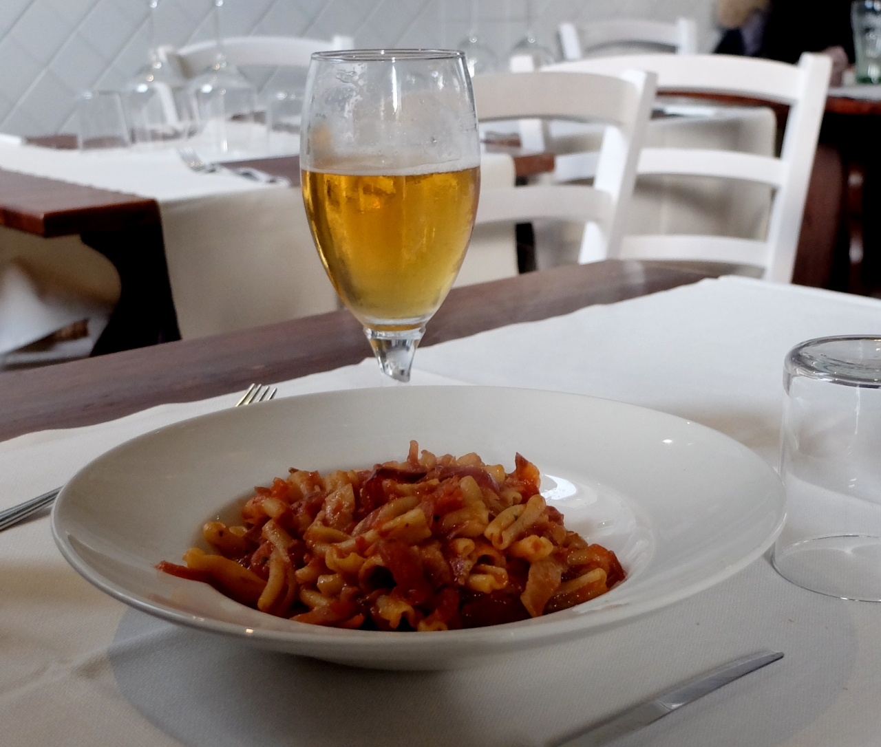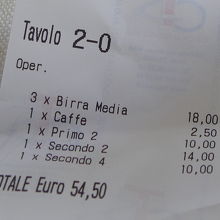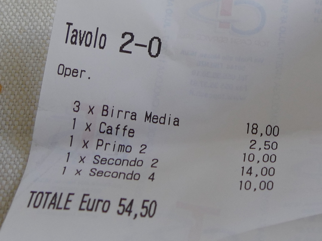 ビール飲んで私のみコーヒー飲んで3人で54.5ユーロ.手ごろだったがこのビーフおいしかった!トマトソースとの相性もいい.サラダ付きもうれしかった.それにしてもモレッティはイタリアの風土に合うビールだね!うまい!
