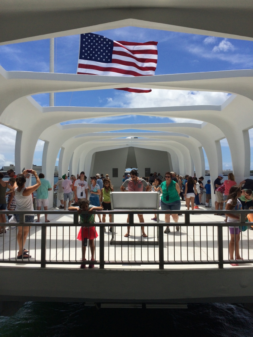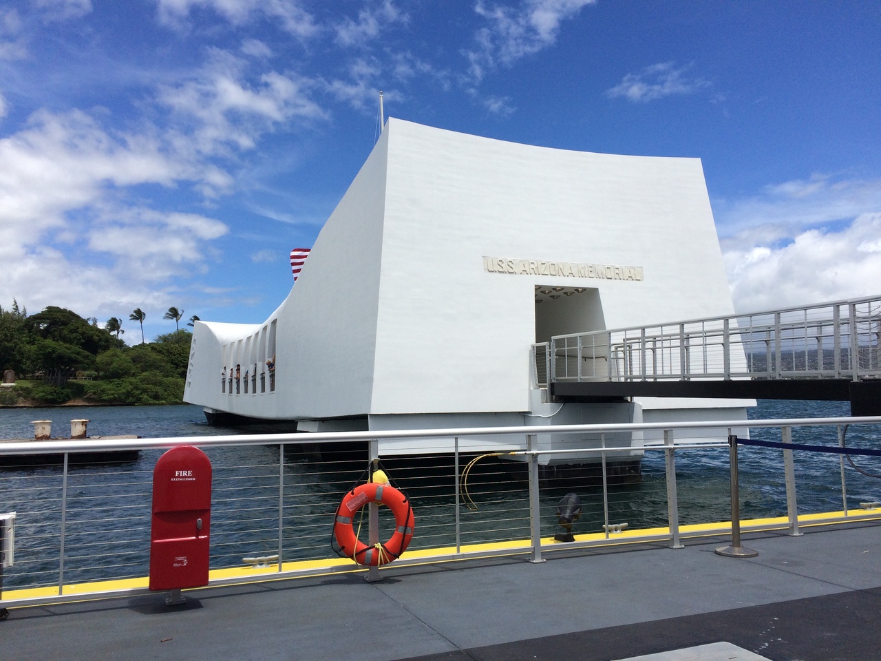 ハワイのパールハーバーにあるアリゾナ記念館。真珠湾攻撃で日本軍が攻撃し、撃沈させられた戦艦アリゾナが今も海の中に沈んでいる場所です。