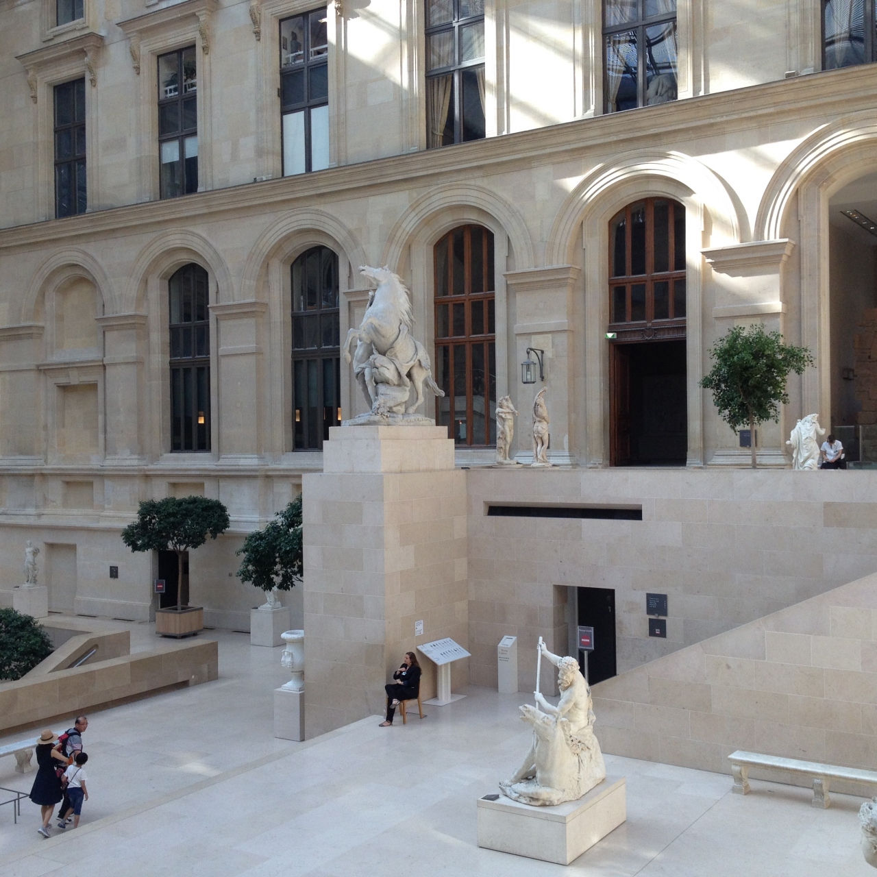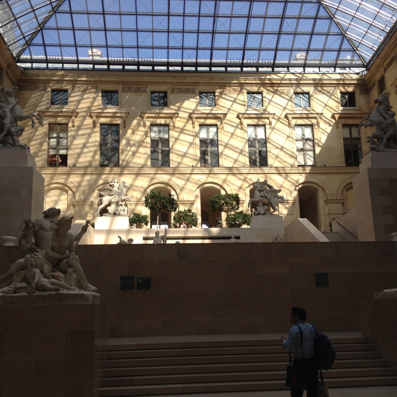 7/9に訪問。土曜日ゆえ混雑を回避するためリヴォリ通りから入り、8:40に到着。既に20人ほど並んでいましたが、10分後には100人近い行列になっていました。9:00に入場し、まずは一目散に「モナリザ」へ。事前のチケット購入と朝一が奏功して10人程度しかおらず、ゆっくり観れました。同様に「ミロのビーナス」や「サモトラケのニケ」も混雑に気を揉むことなく観れました。特に私のおすすめは「マルリーの中庭」です。ここは館内でもマイナーなようで、数人しかいません。陽光がガラス天井から降り注ぐ広いテラスとその両脇を固める馬の彫刻はかつての宮殿であったことを物語っています。ここでのんびりとお茶でもできれば(註:館内は飲食禁止です)王侯貴族の気分でしょう。