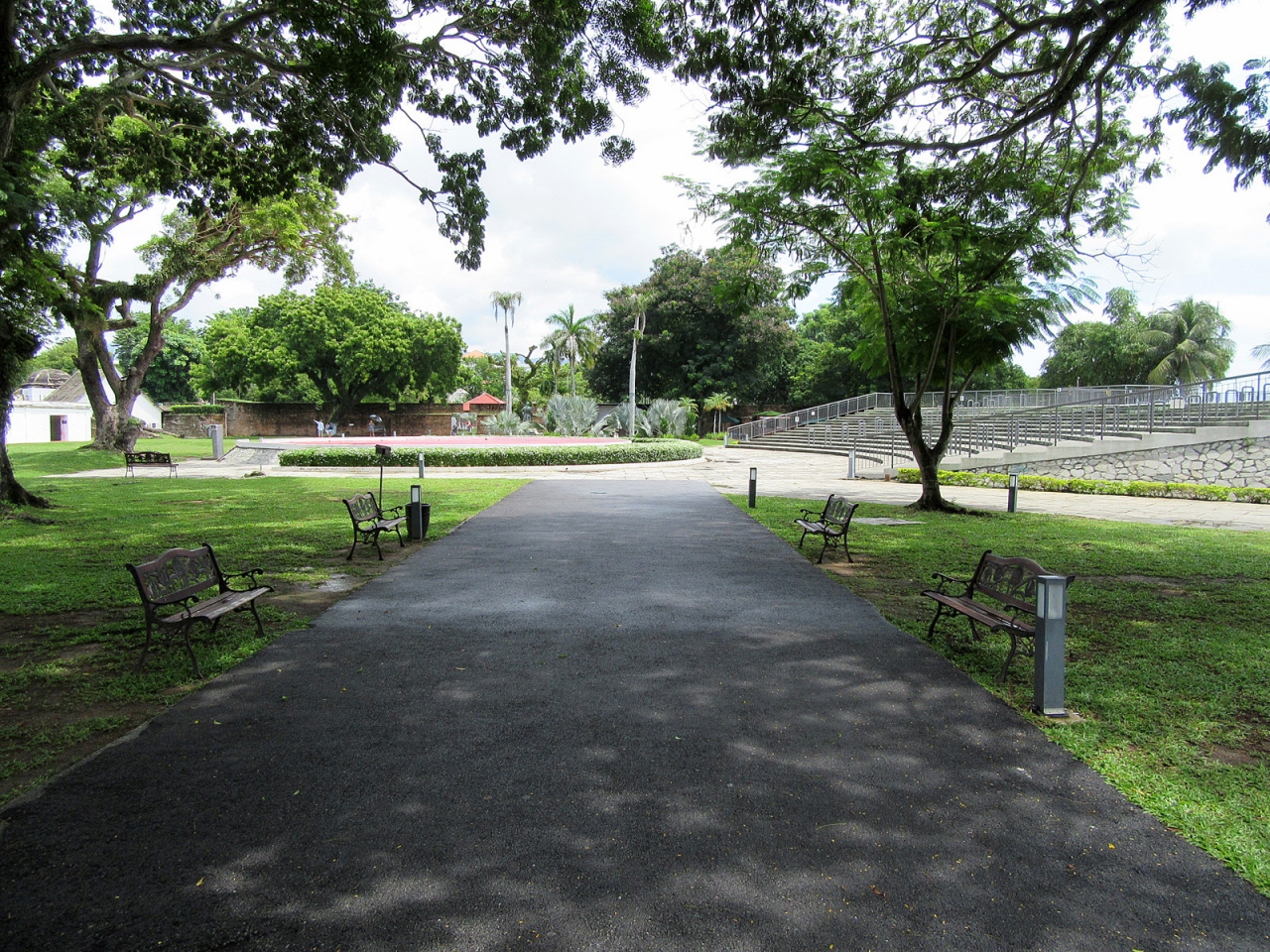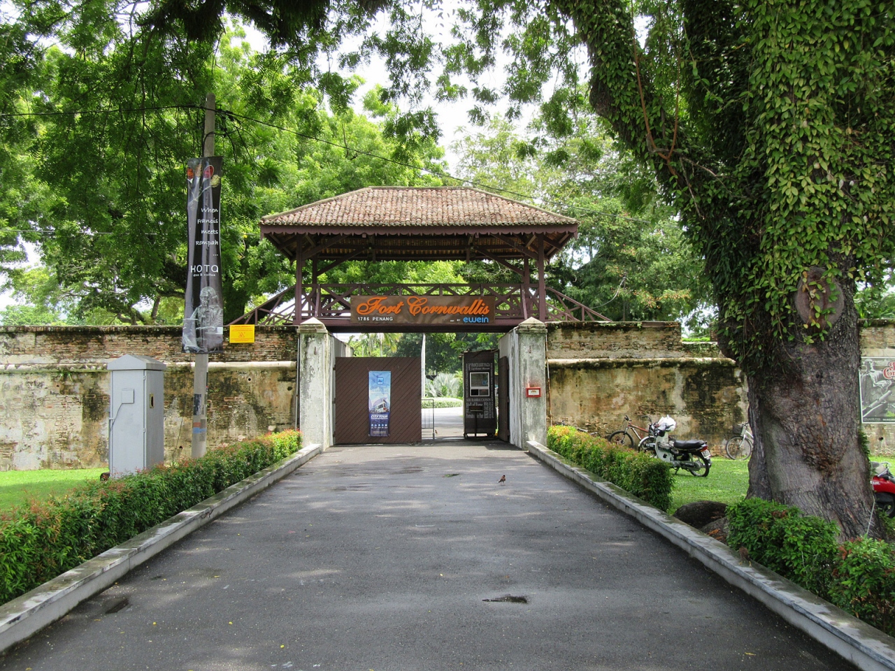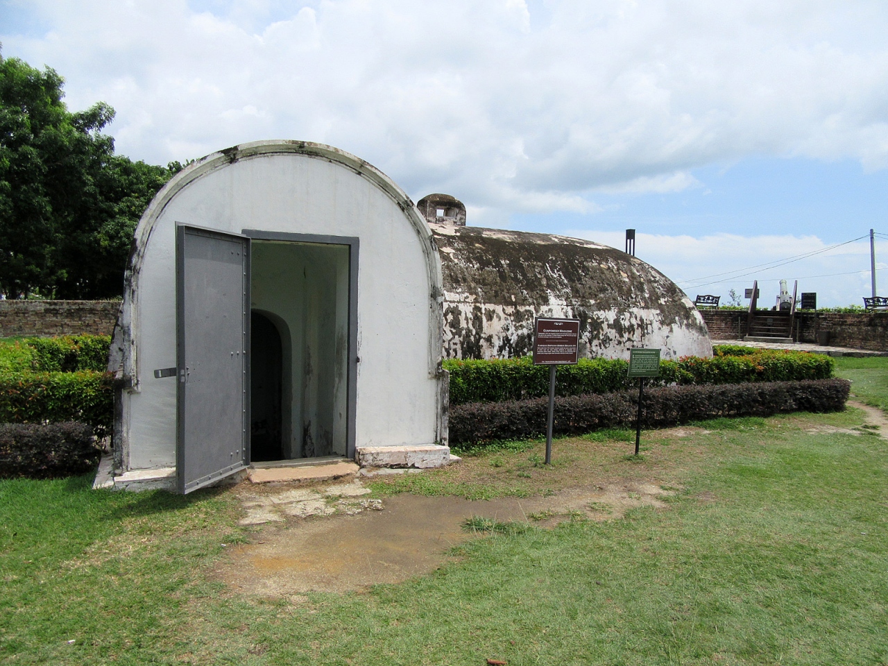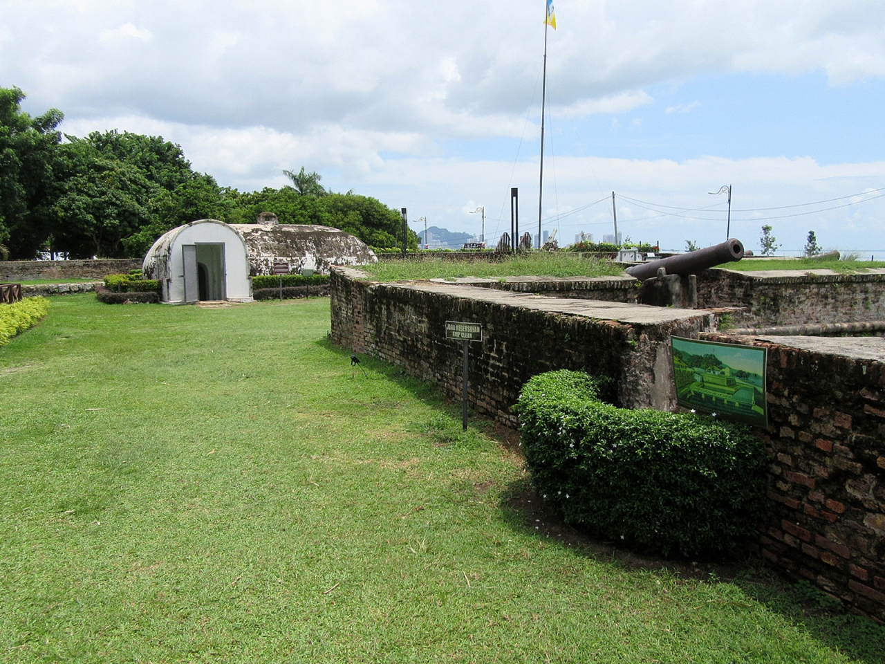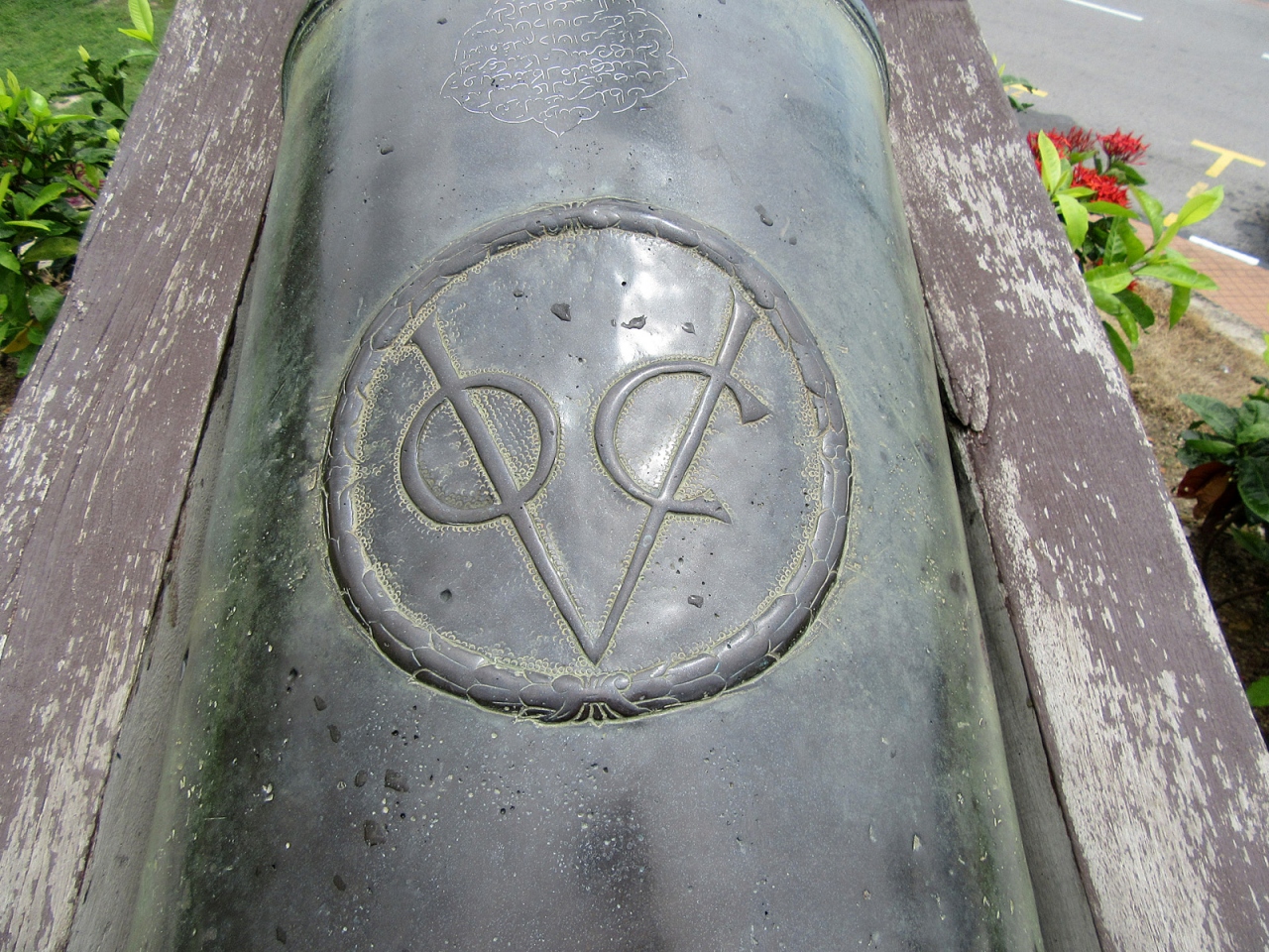 管理者が政府から民間に移管されたことで、昨年にはそれまで2MYRだった入場料が20MYRと一挙に10倍になったということです。日本であれば、ありえない上げ幅です。さて入口で「マレーシア人じゃないですよね?」と尋ねられ「日本人です」と答えると20MYRの料金が提示されました。マレーシア人だと料金が違うのかな…と下を見ると、料金表が掲示してありました。マレーシア人は10MYRなんですね。手首に料金支払済を示すシールをまかれて見学です。かつて兵舎などが置かれていたであろう中央の平地部分の周囲には、石や煉瓦を積み上げて砲台場を築いてあります。なかでもメインはマラッカ海峡方面に向けて設置されたカノン砲で、ほとんどの見学者はカノン砲をバックに記念写真を撮られていました。私もぜひ1枚写真を撮ろうと思って近づいたのですが、そのカノン砲の砲身には何とVOSのマークが…。VOCってオランダ東インド会社の旗印で、ここはイギリス東インド会社が築いた陣地です。要塞が築造されたのは1786年、英蘭戦争に勝利した直後ですから、その築造途上の緊急避難的措置として戦利品の大砲を備え付けたというのはあり得ない話ではないでしょうが、完成後の安定期にまで他国の大砲を使い続けることは兵站のことを考えれば不経済ですし、第一誇り高きイギリス人がそんな装備をゆるはずがありません。史実に基づいた復元・維持・管理を心掛けて欲しいものです。