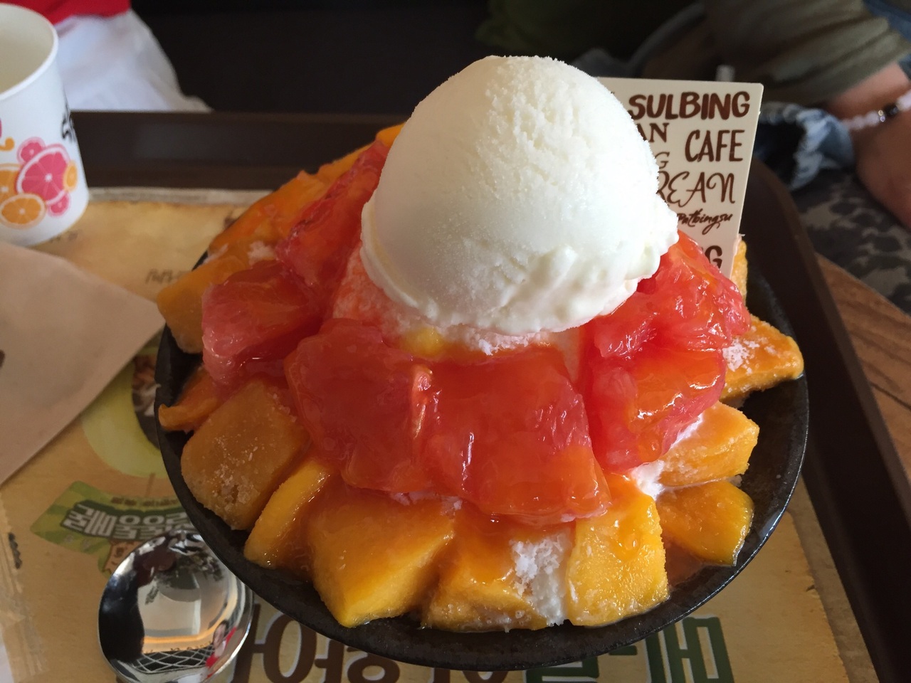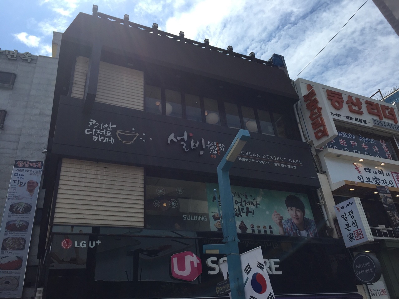韓国で有名なソルビンの本店になります。別のお店でピザとパスタを食べた後に立ち寄りました。1つを3人で食べましたがちょうどいい量でした。お店の雰囲気は落ち着いた雰囲気、悪く言えば暗い感じです。以前、ソウルの大学路のお店に行った事がありますが雰囲気全然違います。大学路のお店は綺麗でオシャレでした。