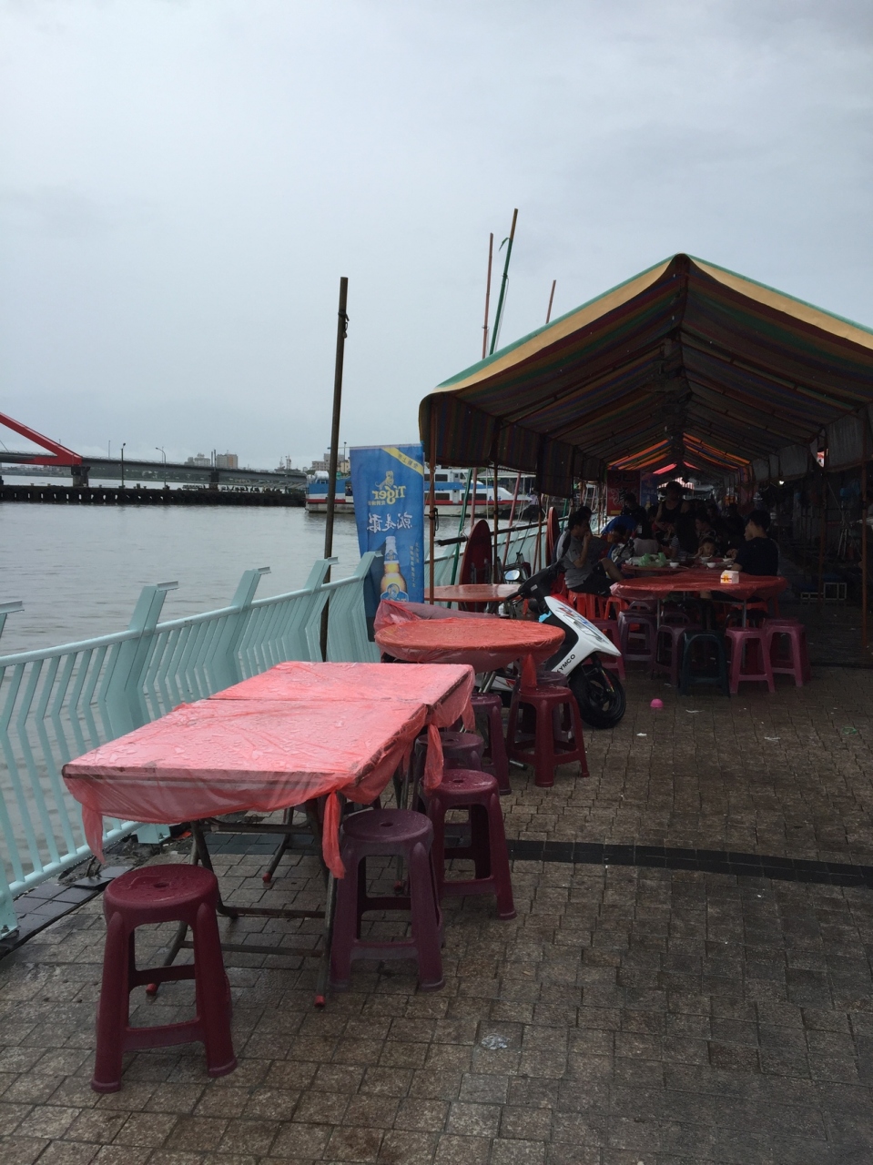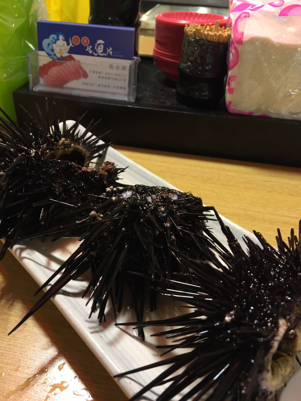 高雄駅のバス乗り場から東港まで行きましたー!バス停降りたら徒歩7~8分で華僑市場です!刺身盛り合わせは醤油、わさび付きで300ドル前後です。ウニは小さいのが一個100ドル、魚のすり身揚げは一個10~20ドルでした。どれも新鮮で美味でした(^_^;)