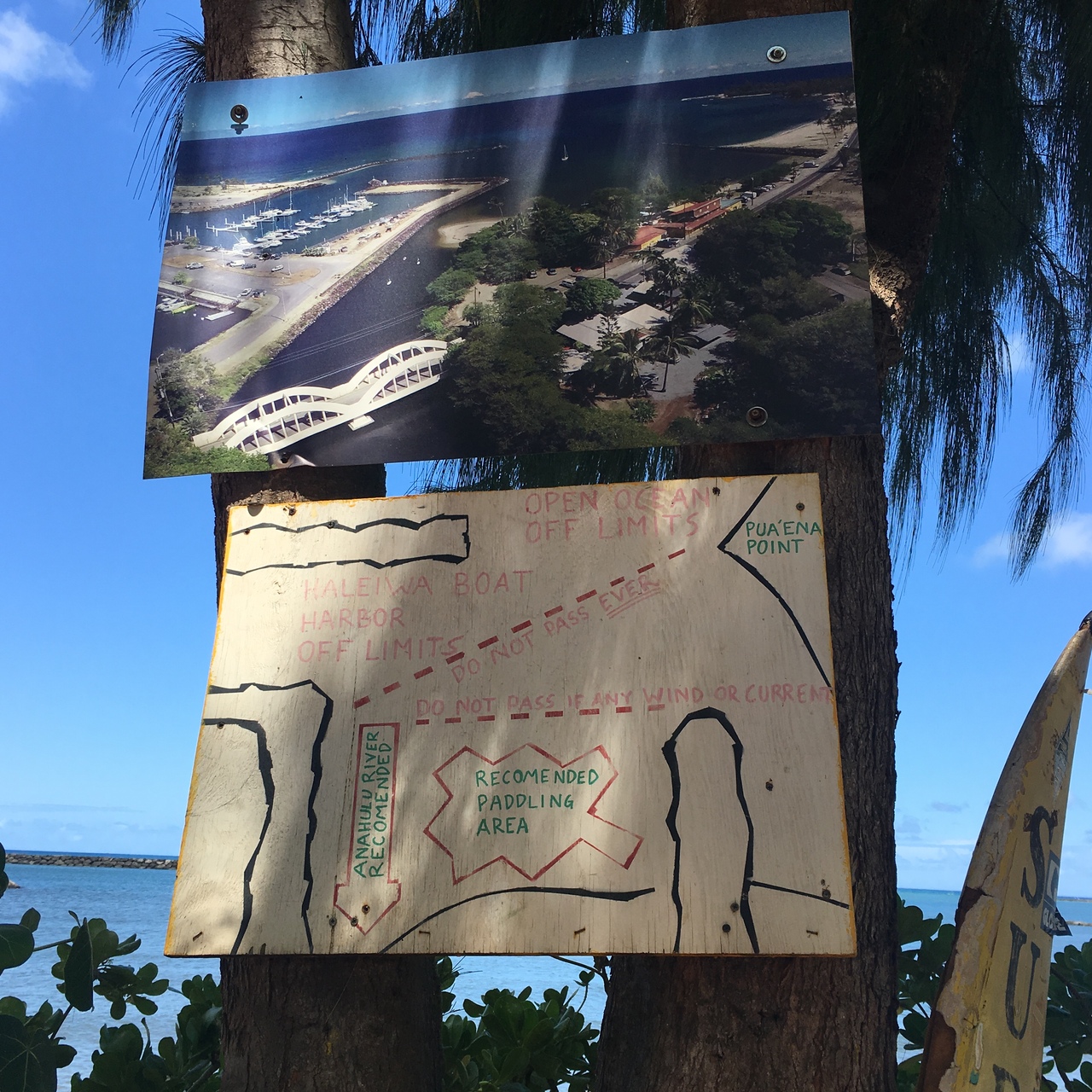 お店の裏にまわると、スタンドアップパドルやカヤックのレンタルなどがありました。外海には出ないようにと注意書きがあります。