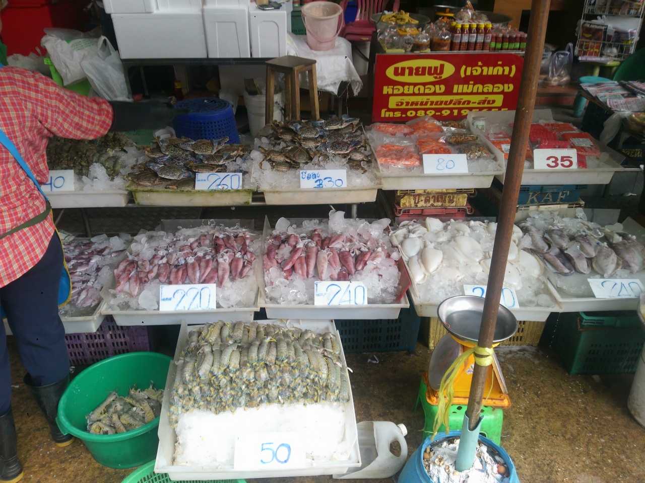 バンコクのタイ国鉄ウォンウィエン・ヤイ駅からローカル線に揺られて1時間ほどでマハーチャイへ到着します。駅の周辺が市場と言うより市場の中に駅がある感じです。海が近いので新鮮な魚介類を売る店が多いです。人出も多くとても活気があります。
