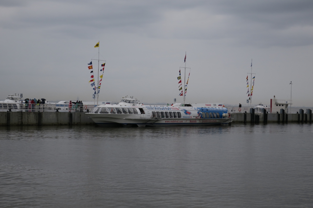 サンクトペテルブルクのエルミタージュ美術館付近から,ペテルゴーフまで直行する高速艇です.値段はちょっと高いのですが,これを使わないと「地下鉄+マルシュルートカ」で1時間近くかかります.景色もよく,快適にのんびり座って行ける高速艇がおすすめです.