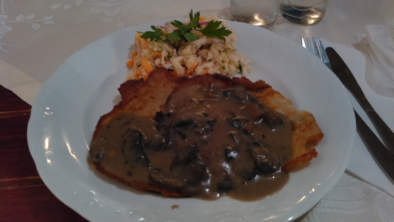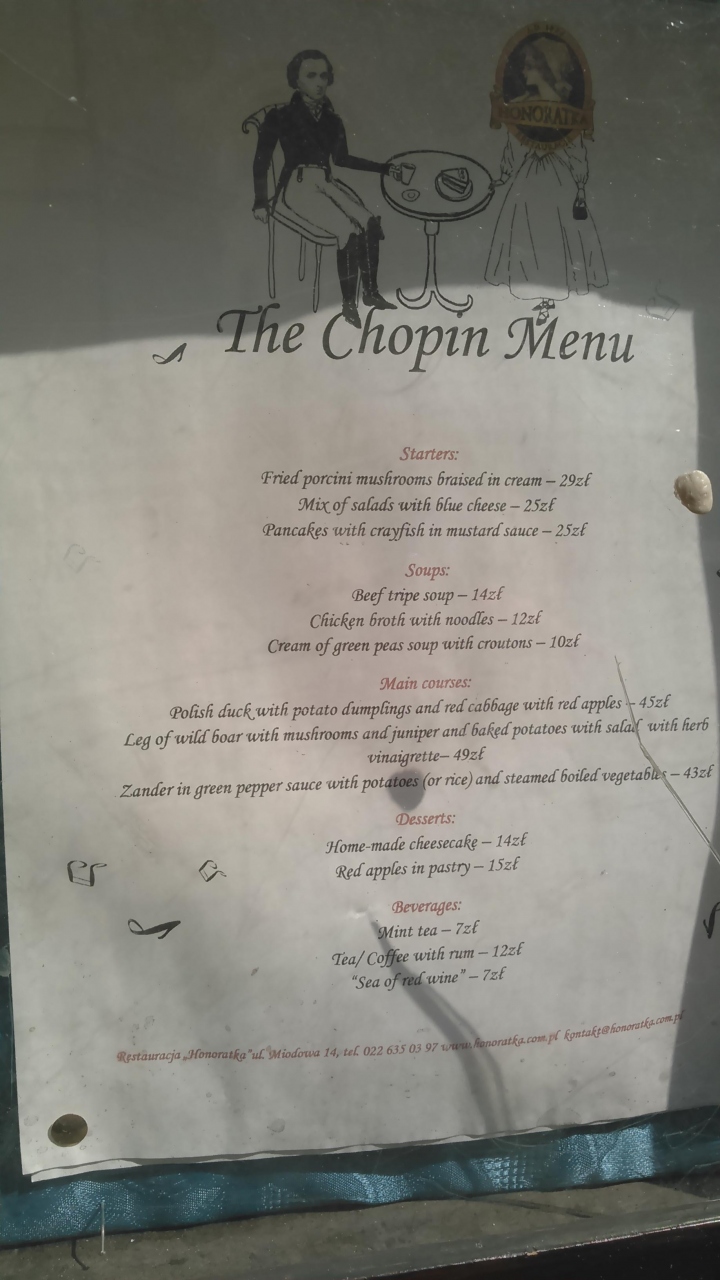 ツアー最終日のランチで訪問しました。ショパンが通ったレストランで、今は経営者は変わっています。地下にあるので、暗いですが、雰囲気は良いです。前菜はサラダ、メインはポテト焼き、最後の食事がこれで、少し寂しかったです。