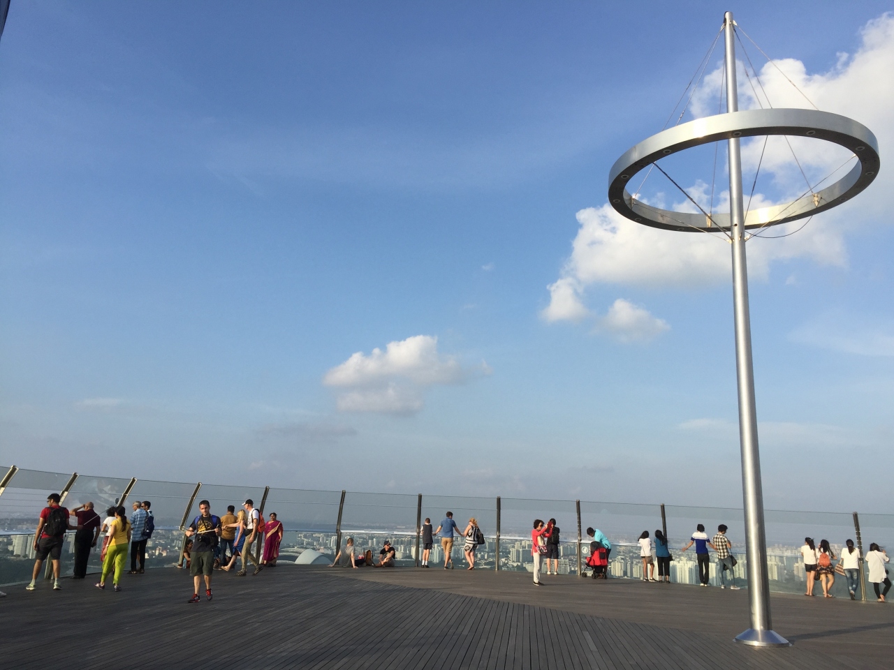 マリーナベイサンズに宿泊したので、ついでに行ってみました。宿泊すると無料です。インフィニティプールのあるフロアのレストラン奥から行くことができます。結構広く、観光客でにぎわっていました。屋根などはありません。景色はキレイでしたがプールから見る眺めに近い為、プールに行けば充分かなと思いました。無料だから行ったものの、お金を払ってまで行くべきかは悩むところです。お土産物屋さんなどもあります。