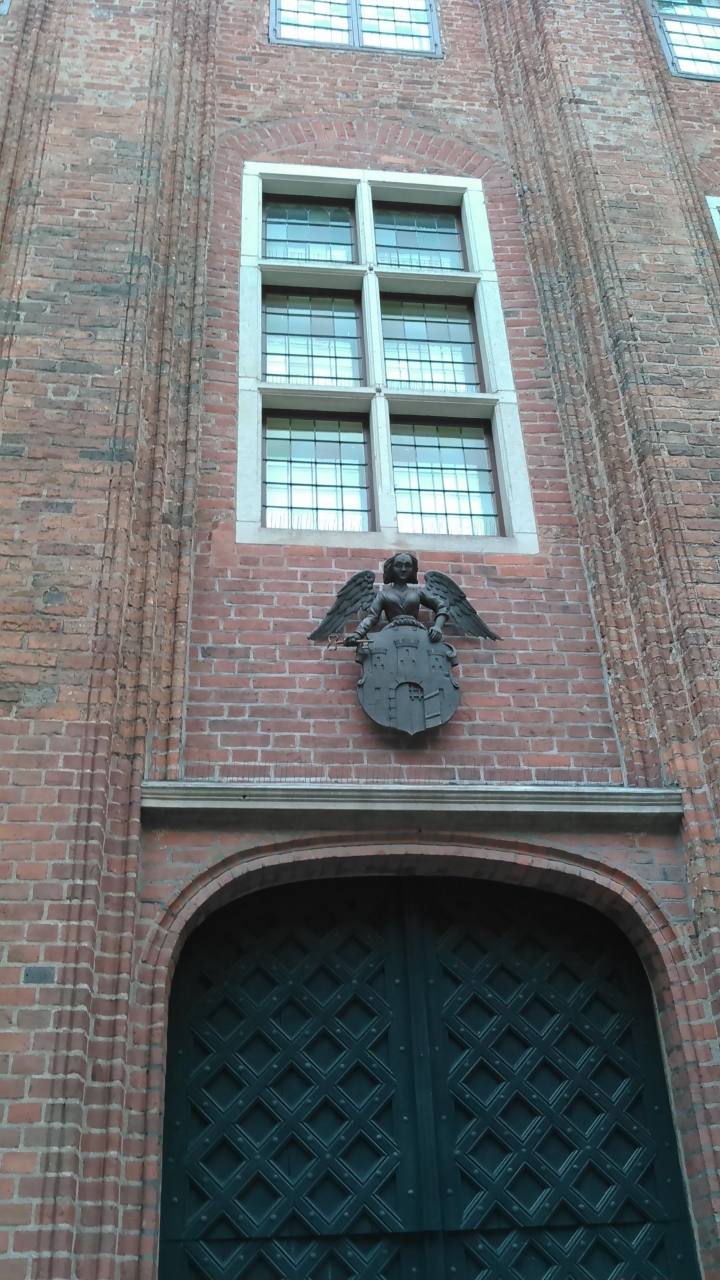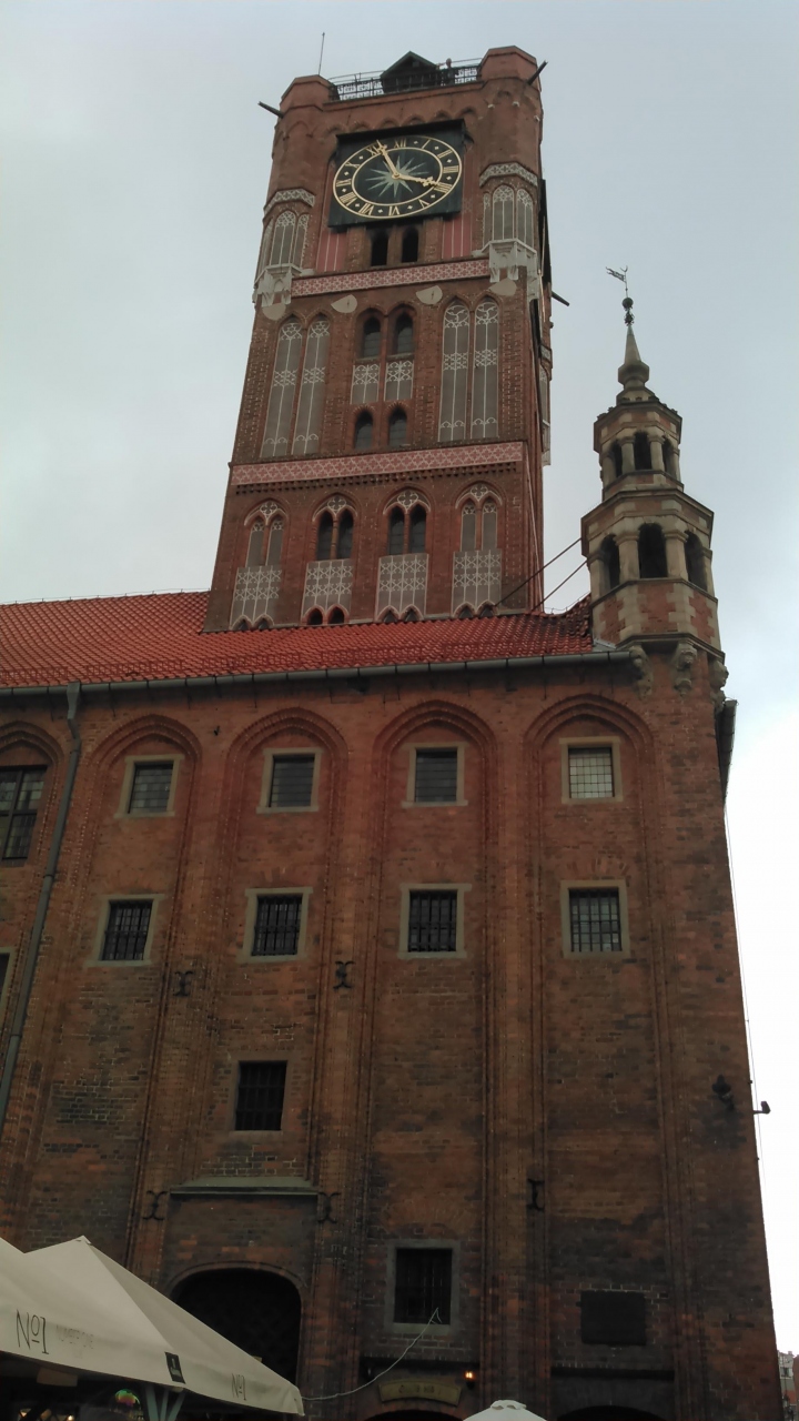 ツアーで訪問しました。コペルニクスの銅像の後ろにあります。14世紀に建てられましたゴシック建築ですが、時計塔の部分は17世紀に加えられたそうです。中庭には天使の像が壁についています。これはトルン市の紋章だそうです。