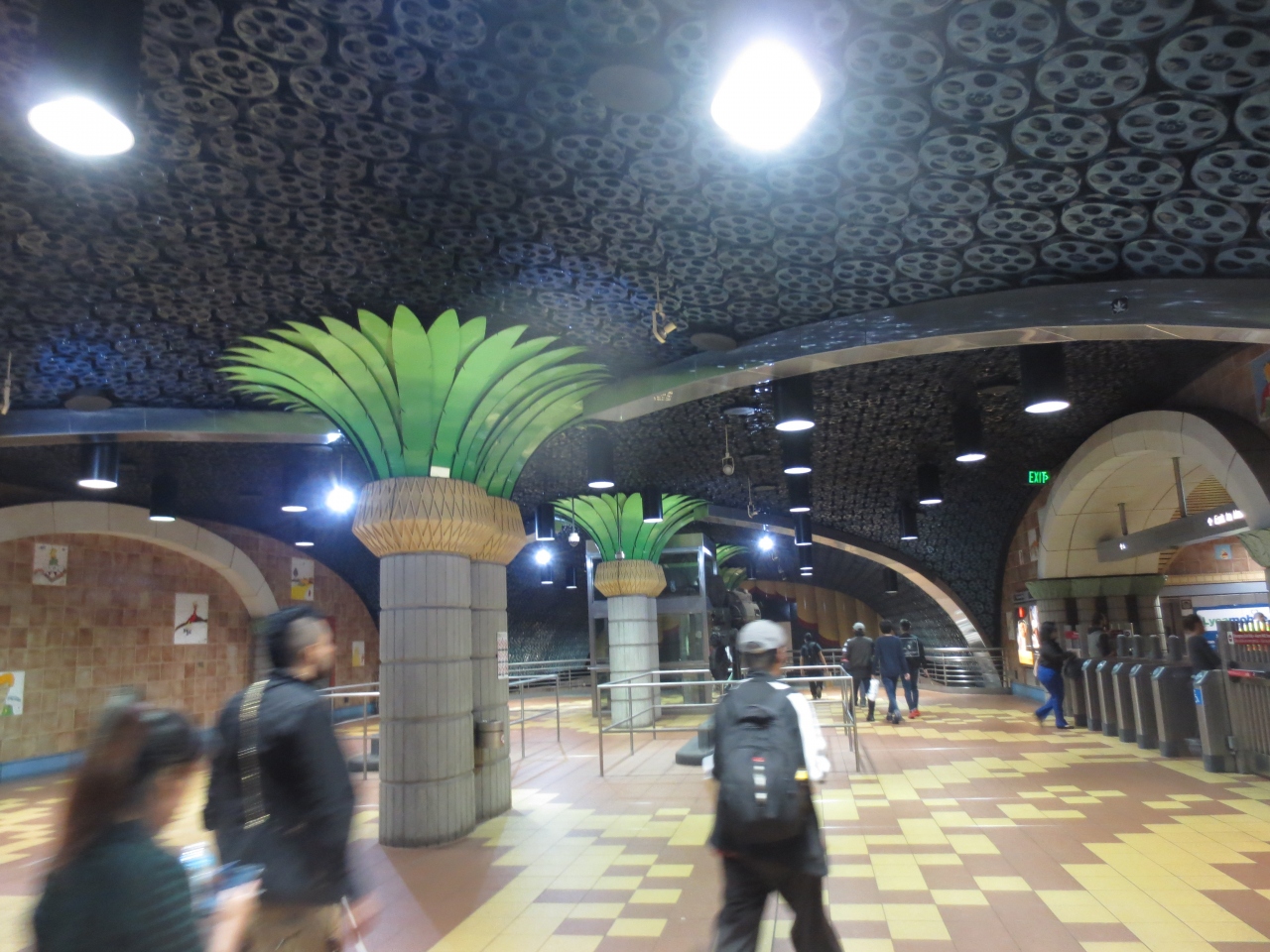 やはり、バスよりもその街に慣れていない者にとっては地下鉄が利用し易く感じました。あちこちの移動を繰り返すうちに途中で気付いたのですが、駅毎に天井や改札からホームへの乗降エスカレーター前にある造作等がそれぞれ違っていました。違う駅を利用する度に、とりあえず上を見て楽しんでいました。ロサンゼルスでメトロと言うのは、地下鉄とバスの総称で、一番近いメトロの駅を教えてくださいと道を聞いたら目の前のバス停を指さされました。アンダーグラウンドと聞かなければいけませんでした。