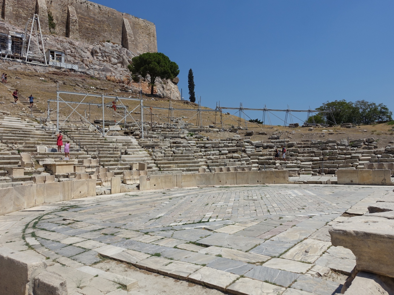 半円形の舞台や、それを取り囲むように、半円形に配置された座席が、現在でもはっきり残されています。嬉しいことにこの遺跡は、立ち入ることができ、特別席だったのでしょうか、背もたれのついた大理石のイスに座ることもできます。