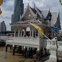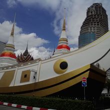 この寺院の特徴は何と言っても船型のオブジェでしょう。コンクリートで作られその中に仏塔が2つ建てられており、後部には仏像が安置されています。船の“お尻”の部分から内部に入ることができます。チャオプラヤー側沿いにある東屋では魚にエサを与えることでタンブンも行えます。