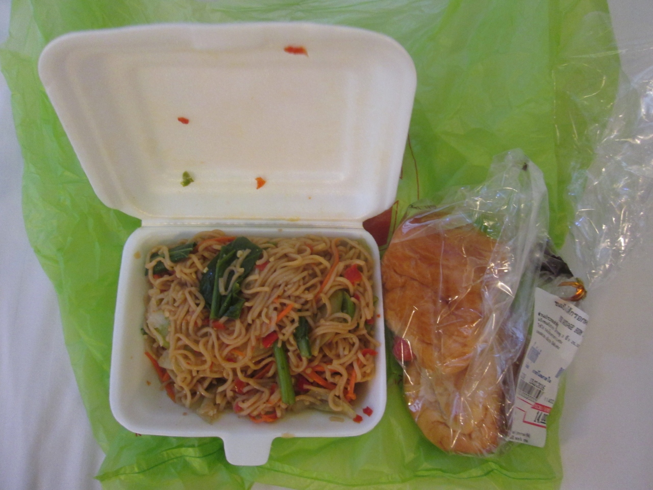 BICCのスーパーマーケットには総菜屋さんとパン屋さんがあり、テイクアウトしてみました。タイ風焼きそばは量り売りで17バーツ、タイ定番のソーセージパンは7バーツでした。小腹が空いたときに試食感覚でタイフードがちょっと食べられるのはありがたいです。