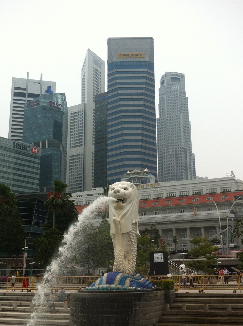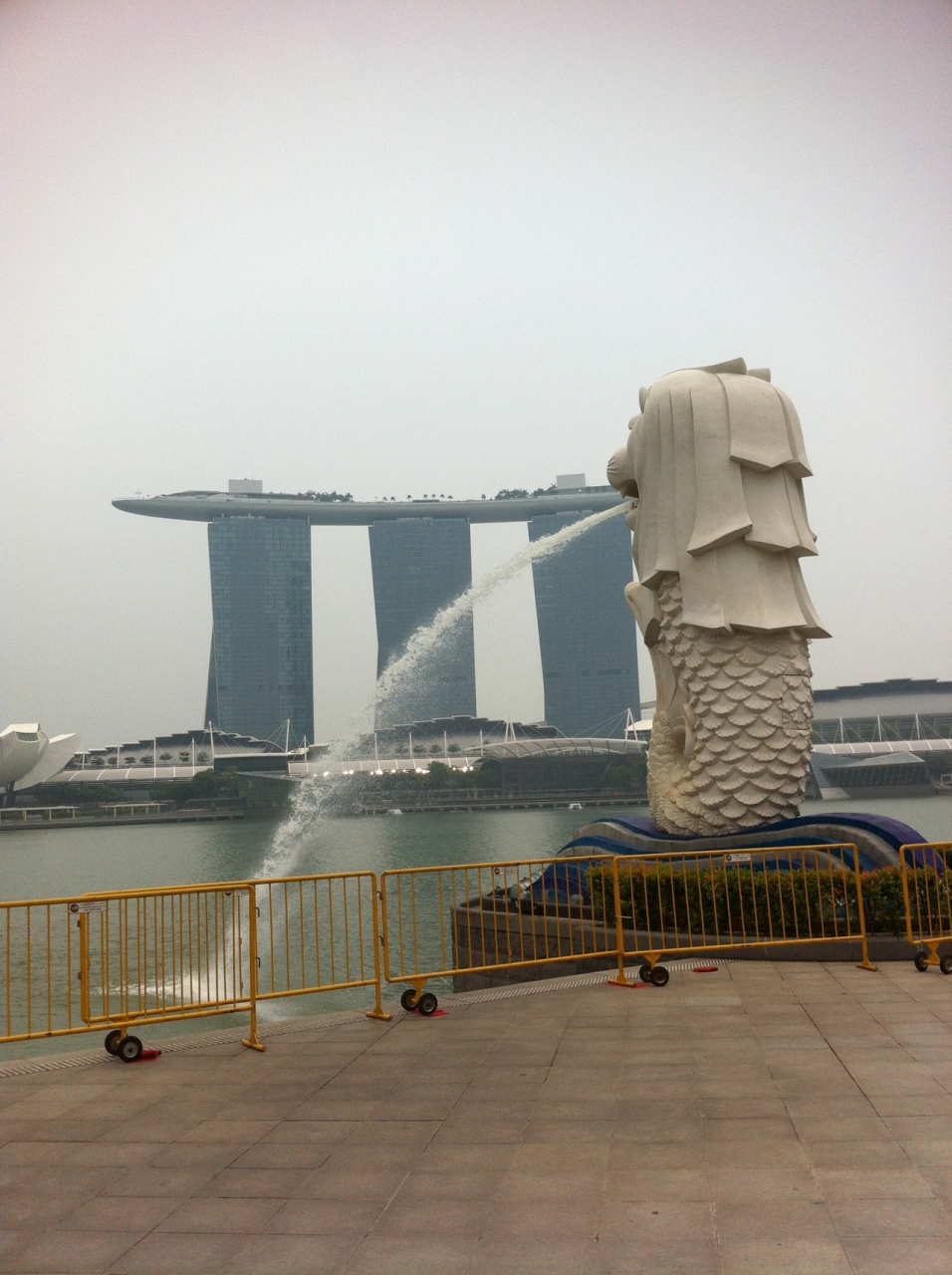 シンガポールの定番観光スポット。対岸にマリーナベイサンズがあるマーライオン公園です。地下鉄の最寄り駅から歩いて10分くらいの距離ですが、日陰が少なく、移動のあるきで汗だくになります。私が観光したときは、マーライオンの海側に黄色の柵がありました。