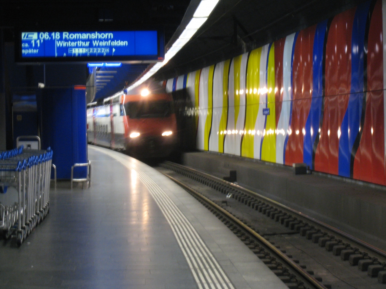 私は、スイスの4日間のパスを買って、チューリッヒ空港駅から、スイスの周遊を始めました。駅でヴァリデーションをしてもらったのですが、早朝のため、まだ窓口が開いておらず、駅員さんが中にいたのは外から見えたので、ノックしてやってもらいました。写真は、空港駅に入ってくる列車の写真です。