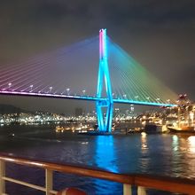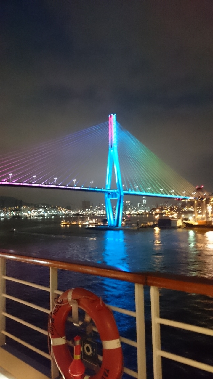 釜山駅近くの釜山港国際ターミナルを利用しました。釜山を出港後に釜山港大橋の下を通過しました。夜だったので、ライトアップされており、幻想的な感じでとてもきれいでした。クルーズで行く時には、外にでて見ることをおすすめします。