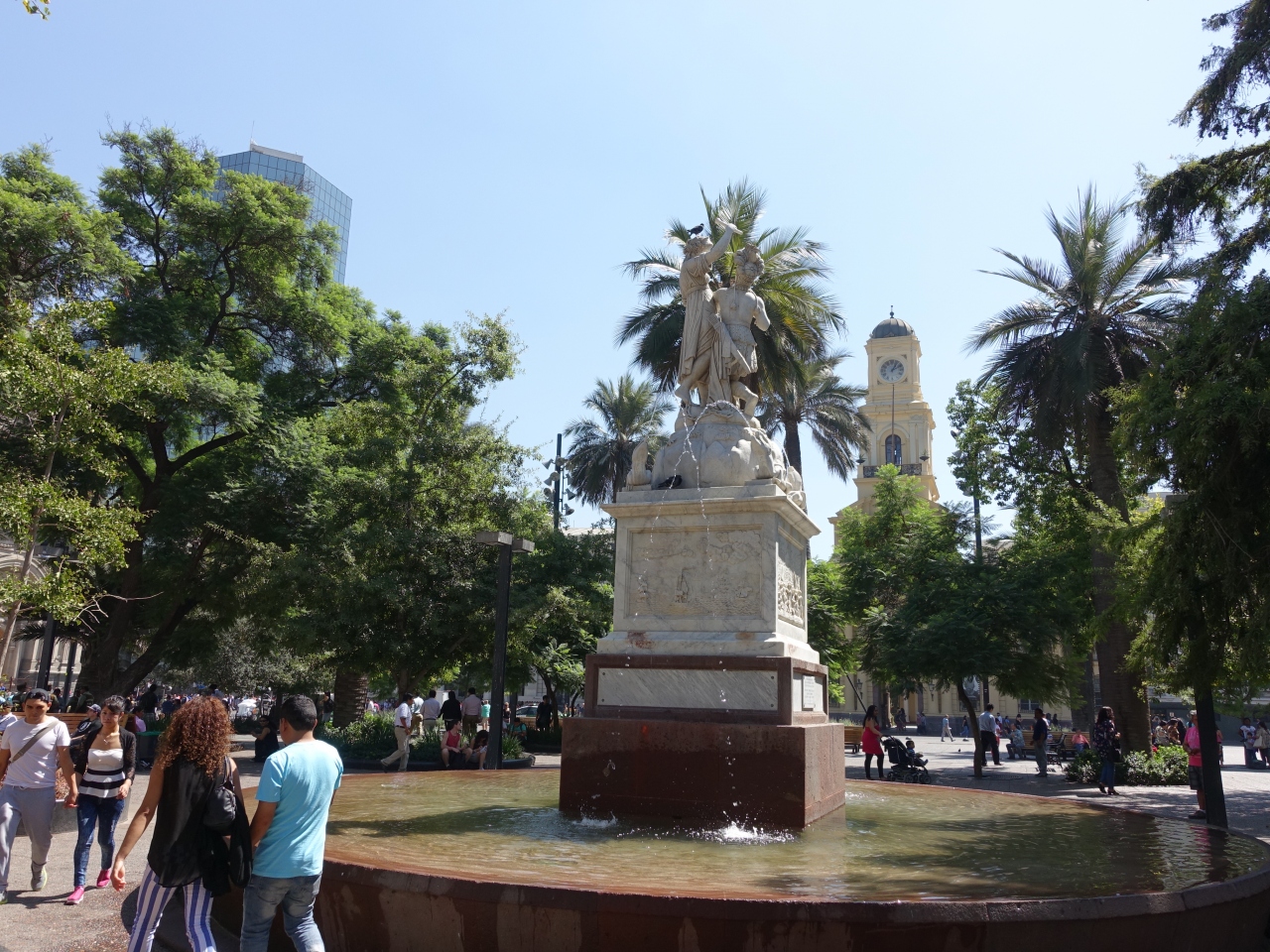 南米の主要都市の旧市街には「アルマス広場」と名の付く広場があるのが一般的ですが、サンチアゴのアルマス広場は、平日昼間から多くの人で賑わいます。周囲を歴史的建物が囲み、旧市街の見どころが広場の周りに凝縮されているような雰囲気です。